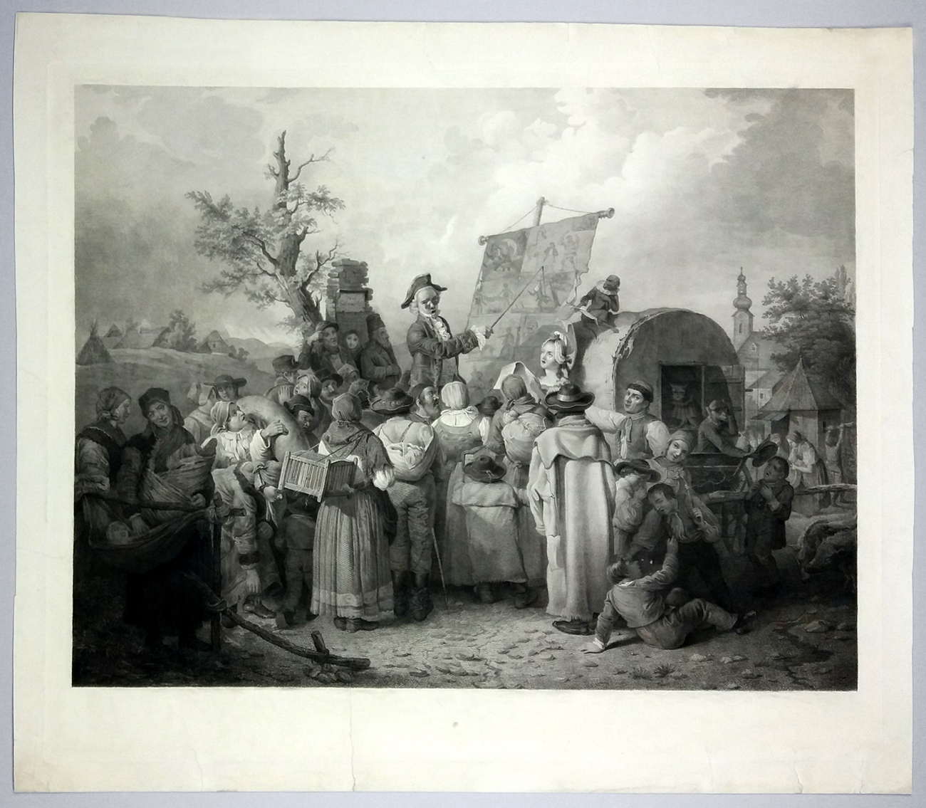 Výjev ukazuje lidové umělce na jarmarku bavící