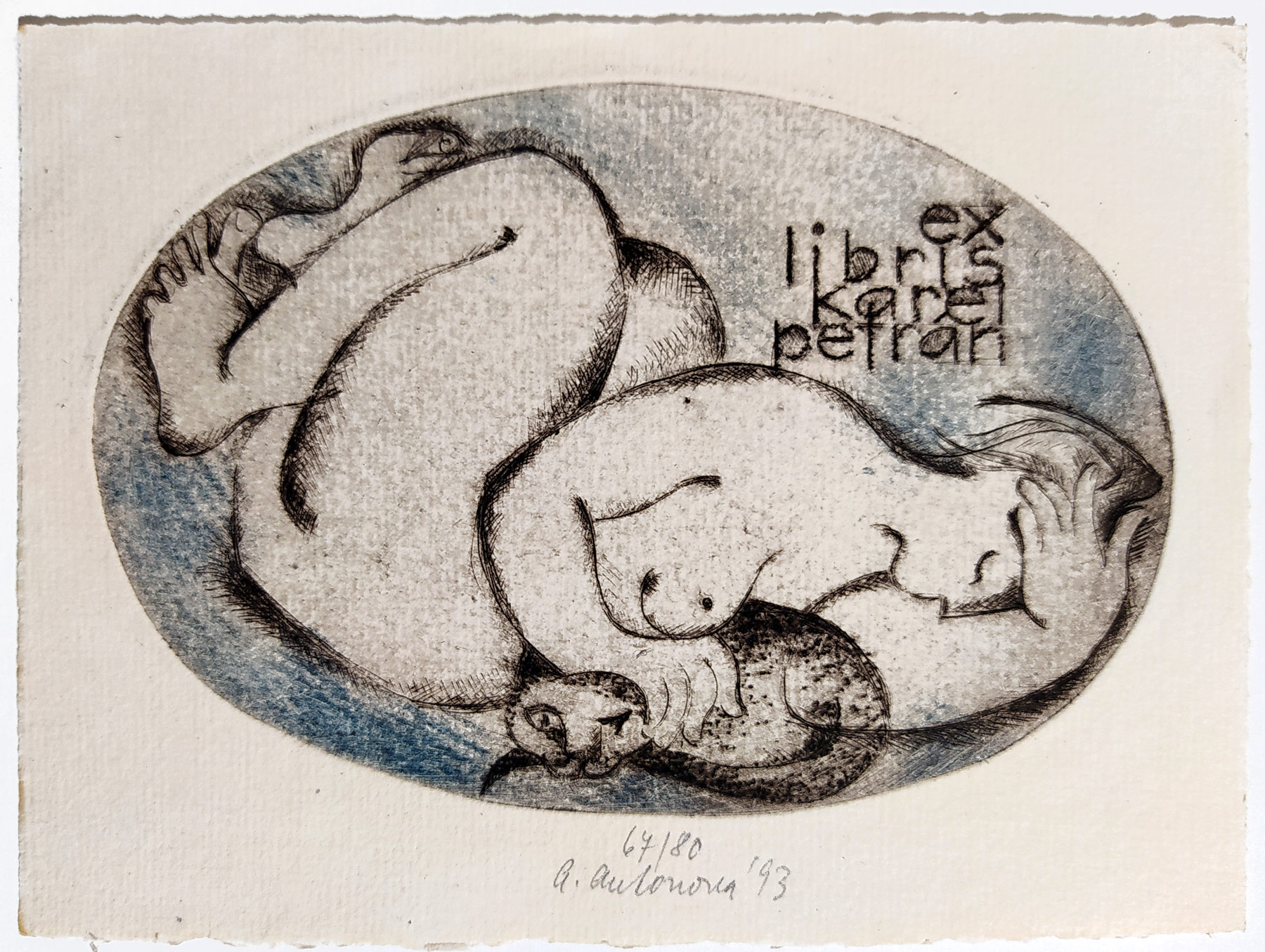 Antonová Alena – Ex libris Karel Petrán, lept a suchá jehla, číslováno 67/80, 1993. Signováno tužkou uprostřed dole s datací. Celkový rozměr: 11,3 cm × 15,3 cm.