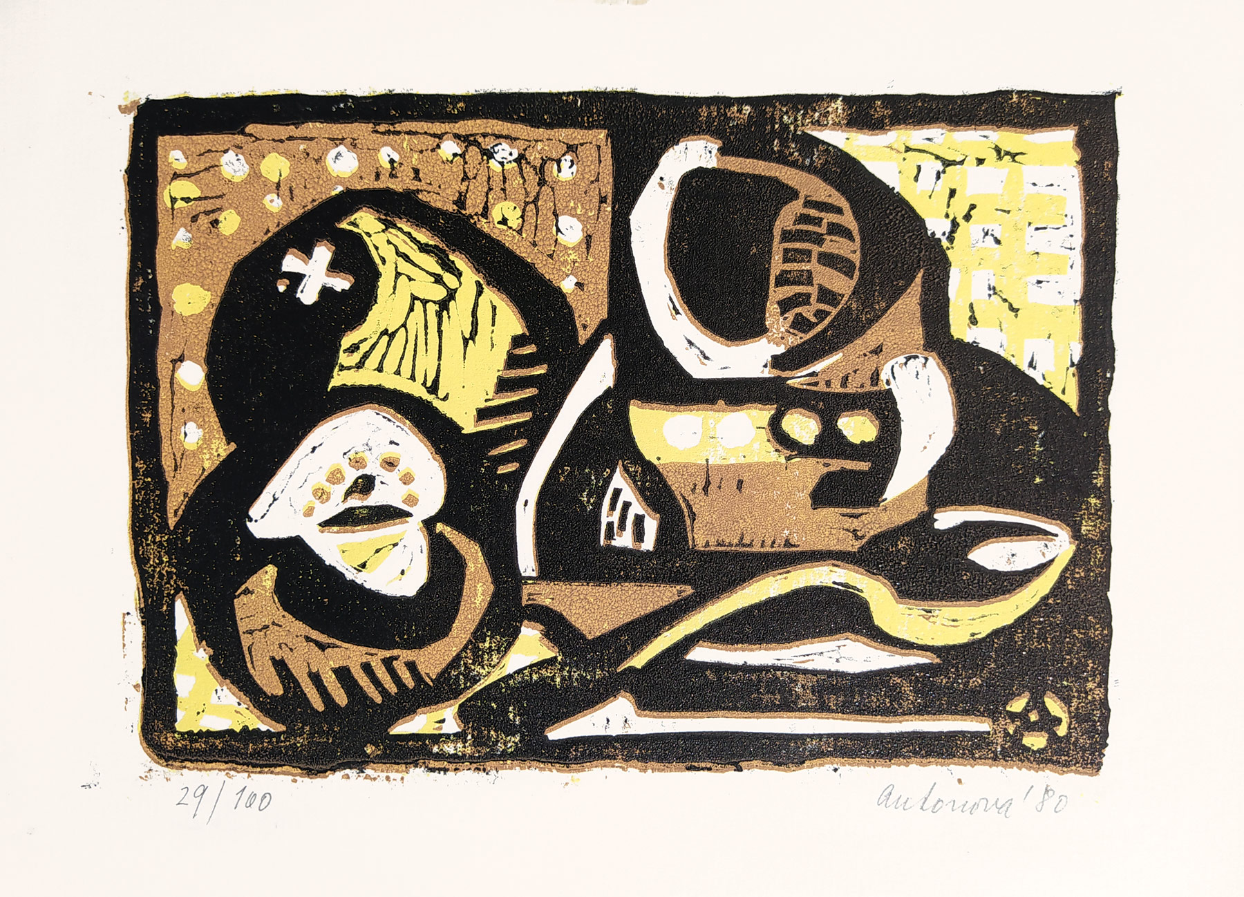 - Antonová Alena – Zátiší, barevný linoryt, číslováno 29/100, 1980