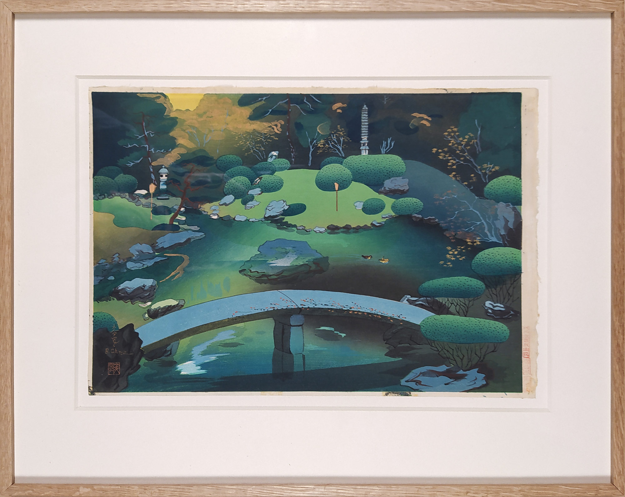 Bakufu Ohno – Zahrady chrámu Shore–in na podzim, ručně kolorovaný barevný dřevoryt, 1950. Signováno vlevo dole. Celkový rozměr: 44,4 cm × 56,2 cm.