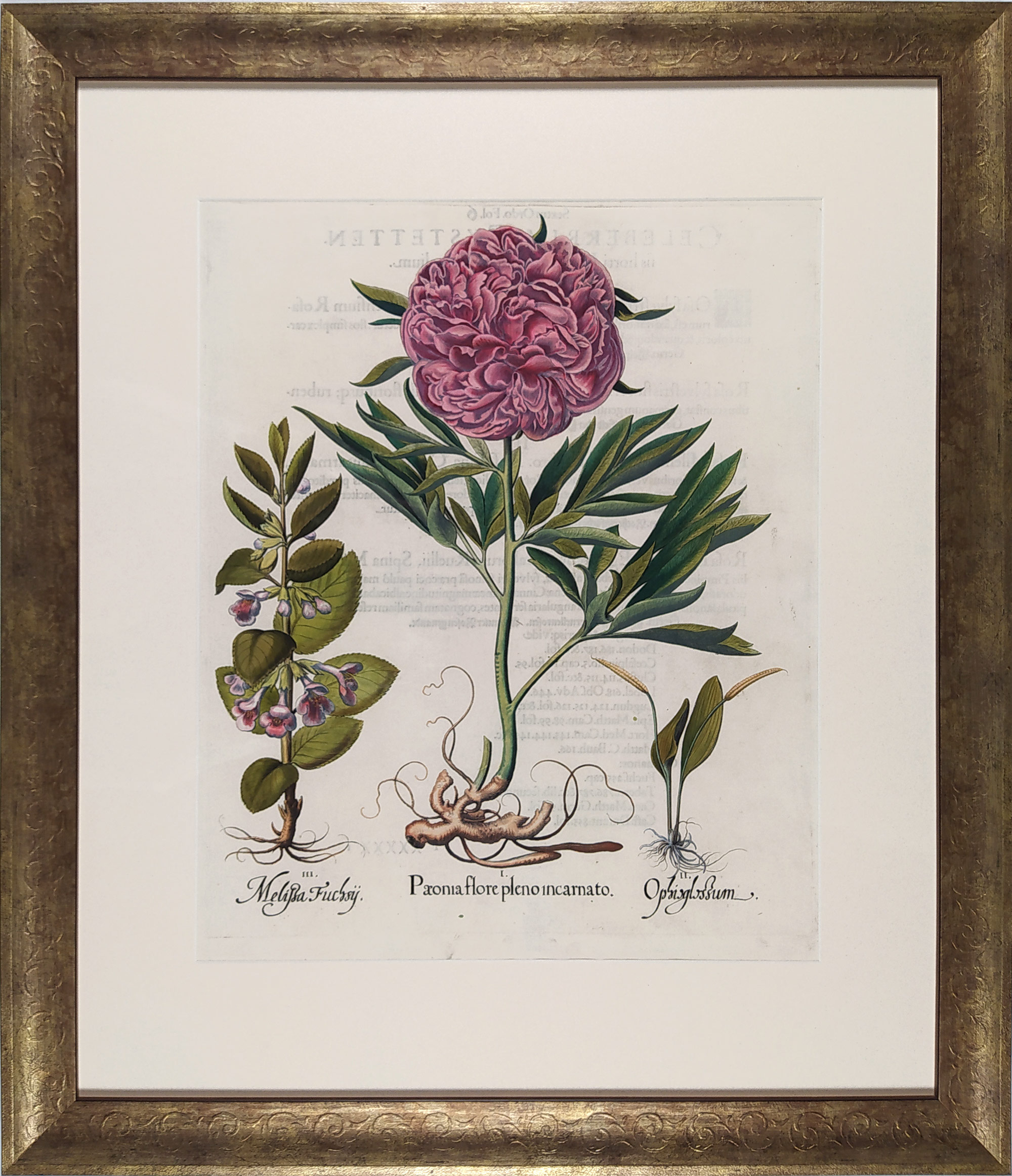 Nádherné zobrazení kvetoucí pivoňky, hadilky a fuchsie. I. Paeonia flore pleno incarnato. II. Ophisglossum. III. Melissa Fuchsÿ. Staře kolorovaný původní mědiryt z B. Beslerova (1561–1629) slavného díla Hortus Eystettensis. Vydáno v Norimberku, 1613.