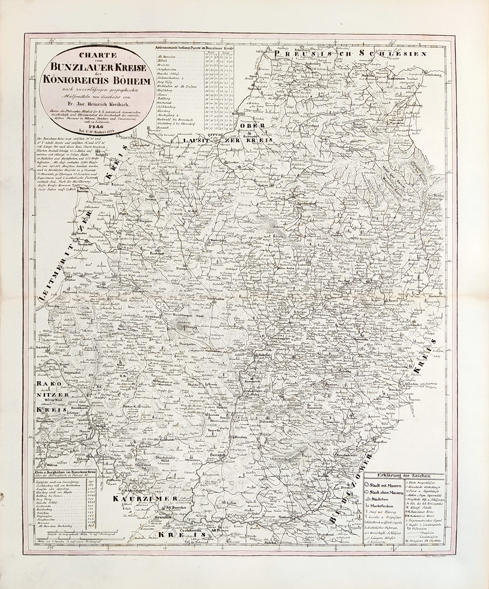 Boleslavský kraj – František Jakub Jindřich Kreibich, staře kolorovaný původní mědiryt, 1834. V oválné kartuši název: „Charte vom Bunzlauer Kreise des Königreichs Böheim … Prag 1834“. Vydal Carl Wilhelm Enders v Praze. Celkový rozměr: 52,7 cm × 43,1 cm.