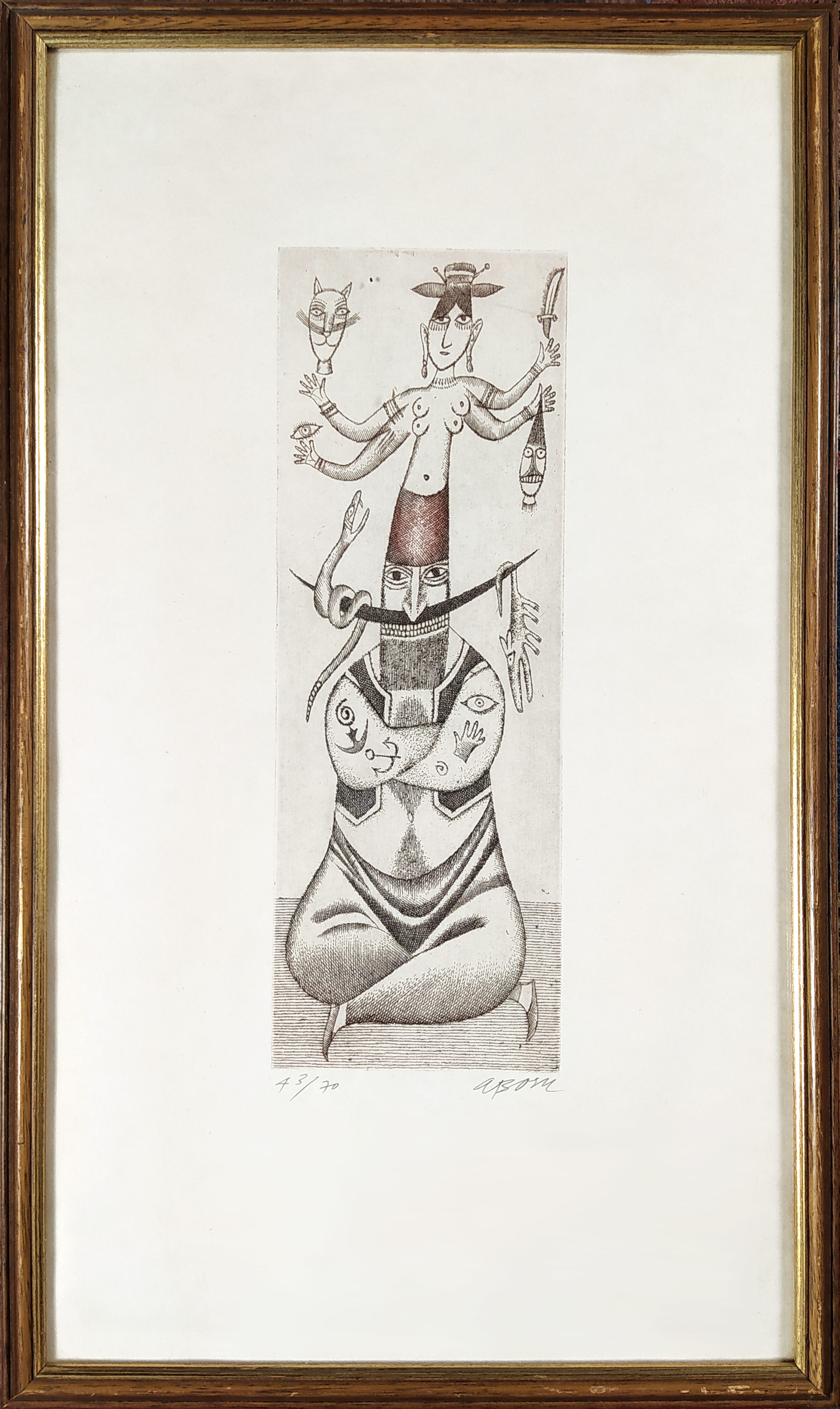 Adolf Born – Fakír, signovaná barevná suchá jehla, číslováno 43/70, nedatováno. Signováno tužkou vpravo dole. Celkový rozměr v rámu: 48,3 cm × 28,9 cm.