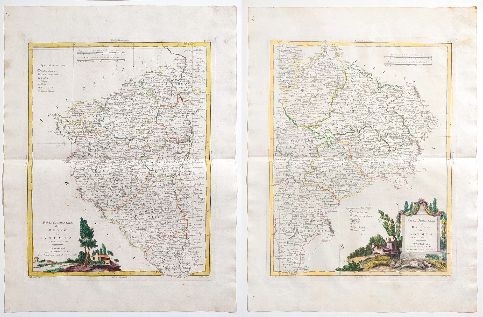 Čechy. „Parte Occidentale del Regno di Bohemia...Parte Orientale del Regno di Bohemia“. staře kolorované původní mědiryty, A. Zatta, Benátky, 1794. Podle G. Zulianiho kreseb ryl G. Pitteri. Se dvěma titulními kartušemi. Mapa Čech tištěná ze dvou desek. Každá o rozměru 43,0 cm × 33,0 cm (celkem 43,0 cm × 66,0 cm). Nesesazeno.
