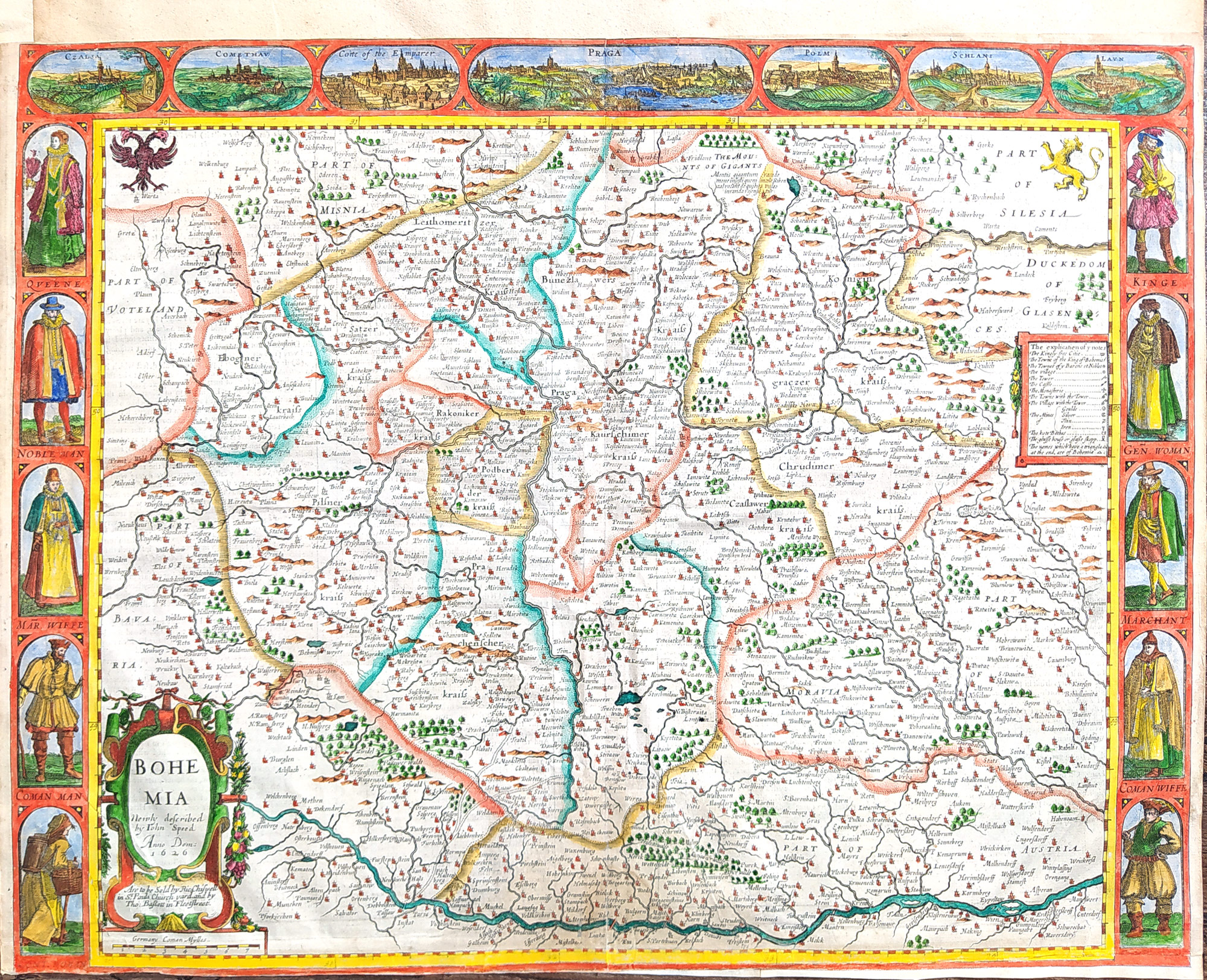Mapa Čech „Bohemia Newly described by Iohn Speed Anno Dom: 1626“. Původní, staře kolorovaný mědiryt, J. Speed, 1626. Vyd. R. Chiswell & T. Bassett, Londýn, 1676. Mapa s ornamentální titulní kartuší, další ornamentální kartuší s vysvětlivkami („The explicatien of y notes“) a českým lvem a německou orlicí v horních rozích mapy. Nad mapou lišta s pěti důležitými českými městy tehdejší doby (Čáslav, Chomutov, Praha, Polná, Slaný, Louny) a Hradčany, po stranách lišty s postavami různých stavů v dobových krojích.