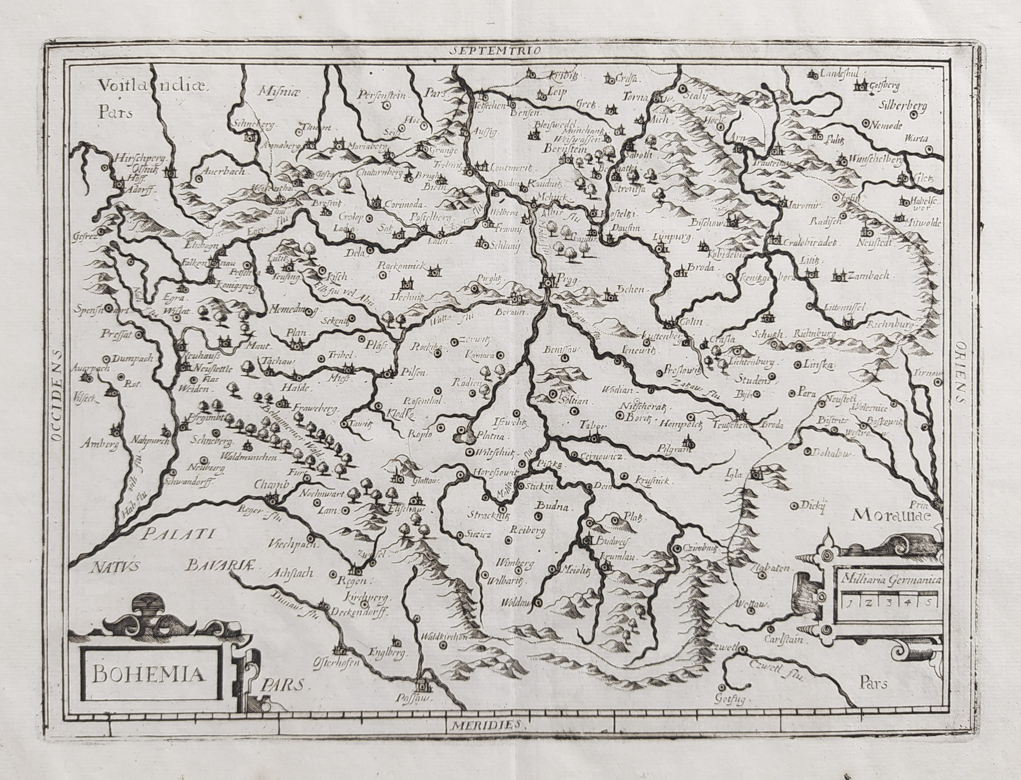 Čechy – Mapa Čech „Bohemia“. Gerard Mercator, Jodocus Hondius, původní mědiryt, ca 1620. Hondius je autorem kapesní adaptace nazvané Atlas minor (poprvé Amsterdam 1607), kterou pak vydal s finančním přispěním Jana Janssonia st. I tato verze obsahovala výše zmíněné mapy Čech, Moravy a Slezska.