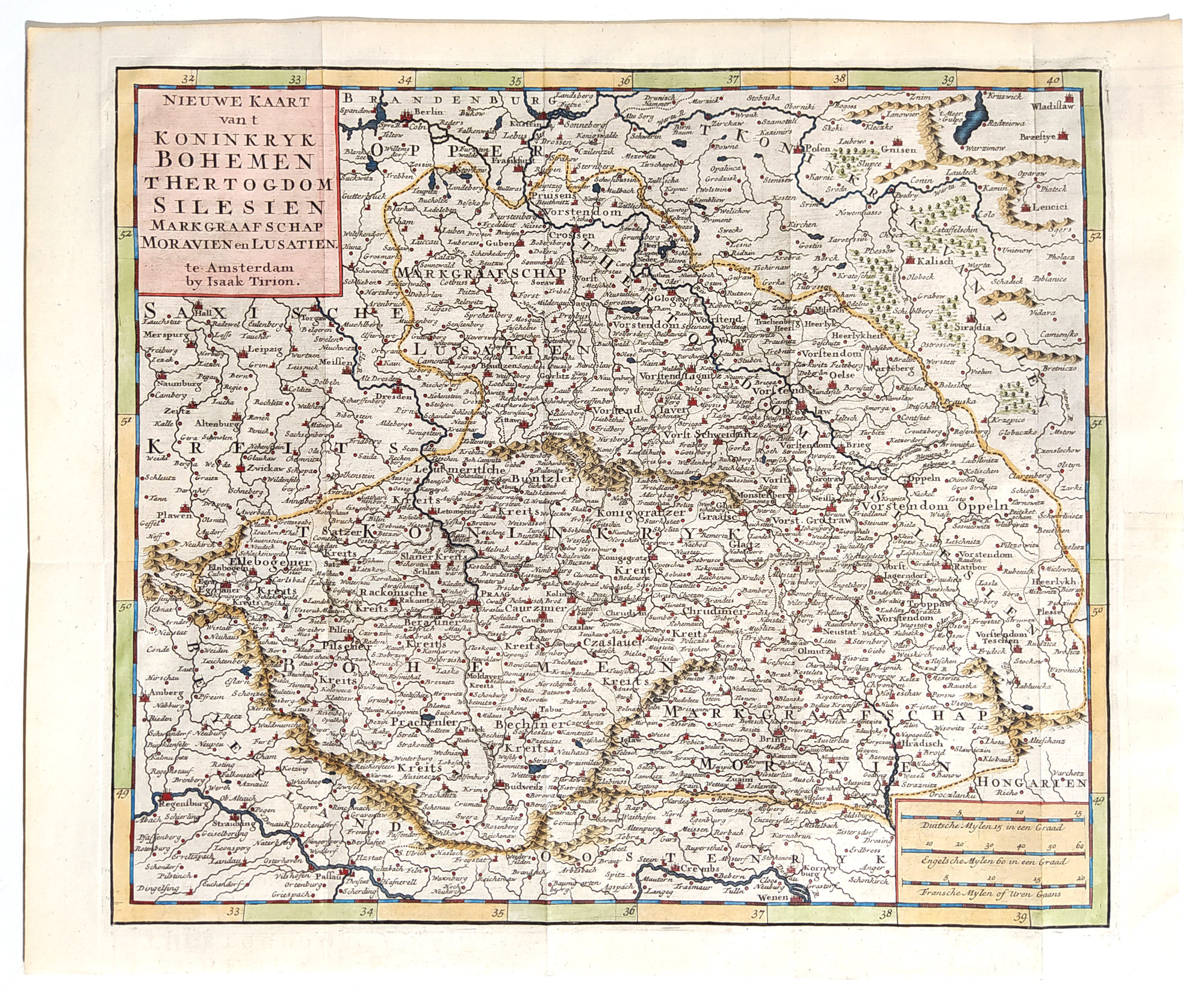 Čechy, Morava, Slezsko a Lužice – Isaak Tirion, původní staře kolorovaný mědiryt, ca 1740. Název mapy v kartuši: „Nieuwe Kaart van t Koninkryk Bohemen T Hertogdom Silesien Markgraafschap Moravien en Lusatien. te Amsterdam by Isaak Tirion.“ Celkový rozměr: 31,2 cm × 38,4 cm.