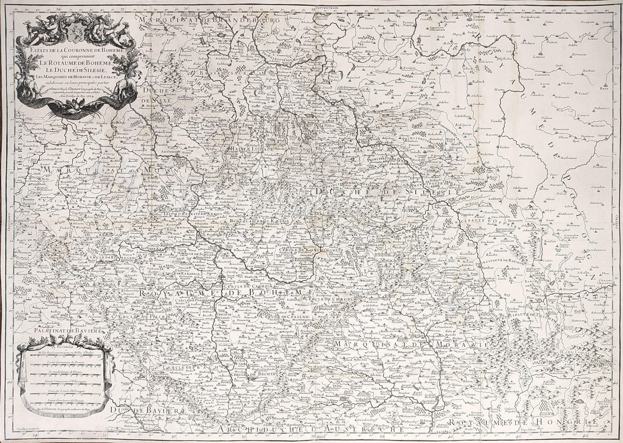 Vydal Alexis Hubert Jaillot v Paříži, 1695. S figurální a ornamentální titulní kartuší s českým erbem, další ornamentální kartuší. Celkový rozměr: 47,0 cm × 66,2 cm.