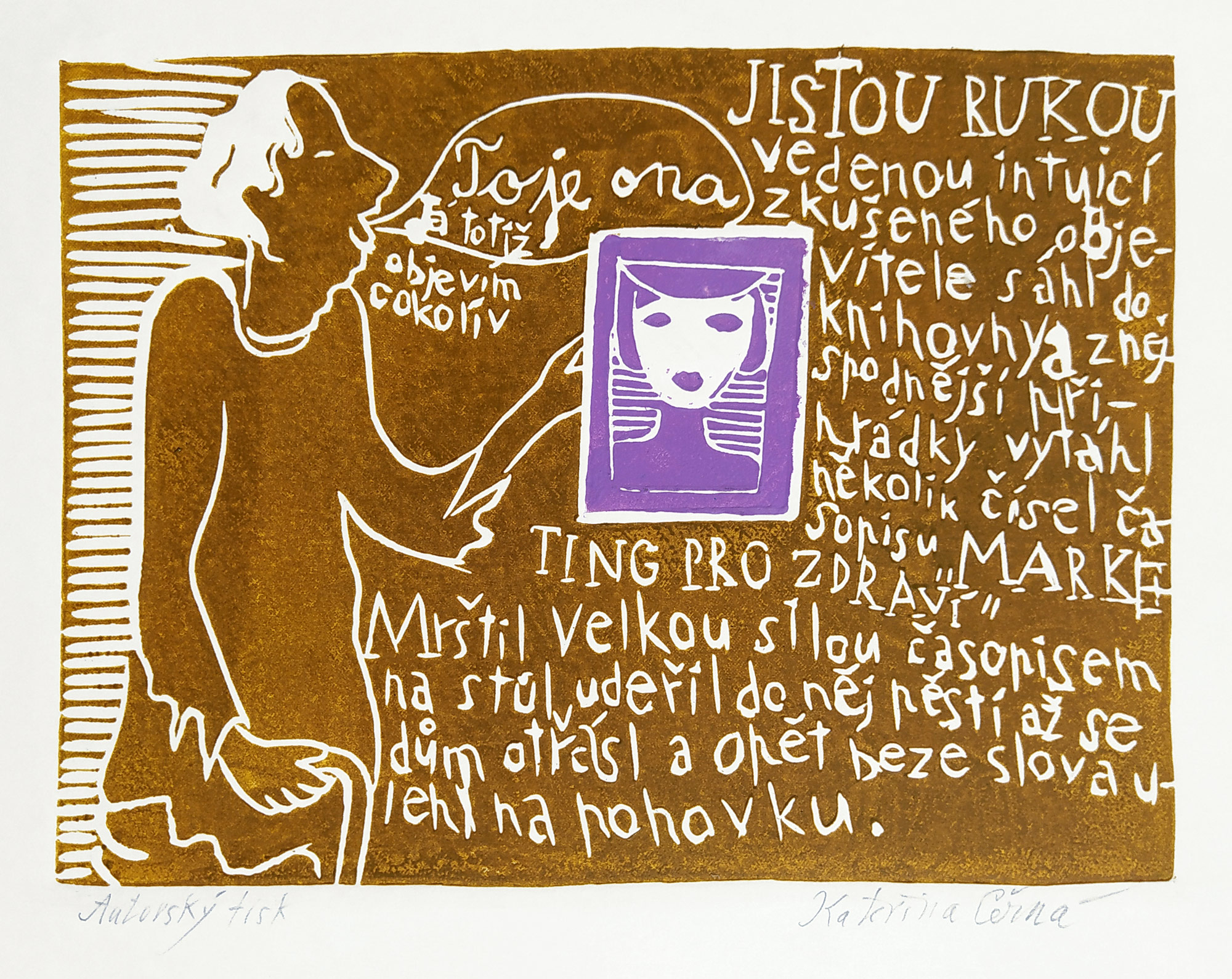 - Černá Kateřina – z knihy: O červené Karkulce trochu jinak, č. 3, dvoubarevný linoryt, AT, 2003