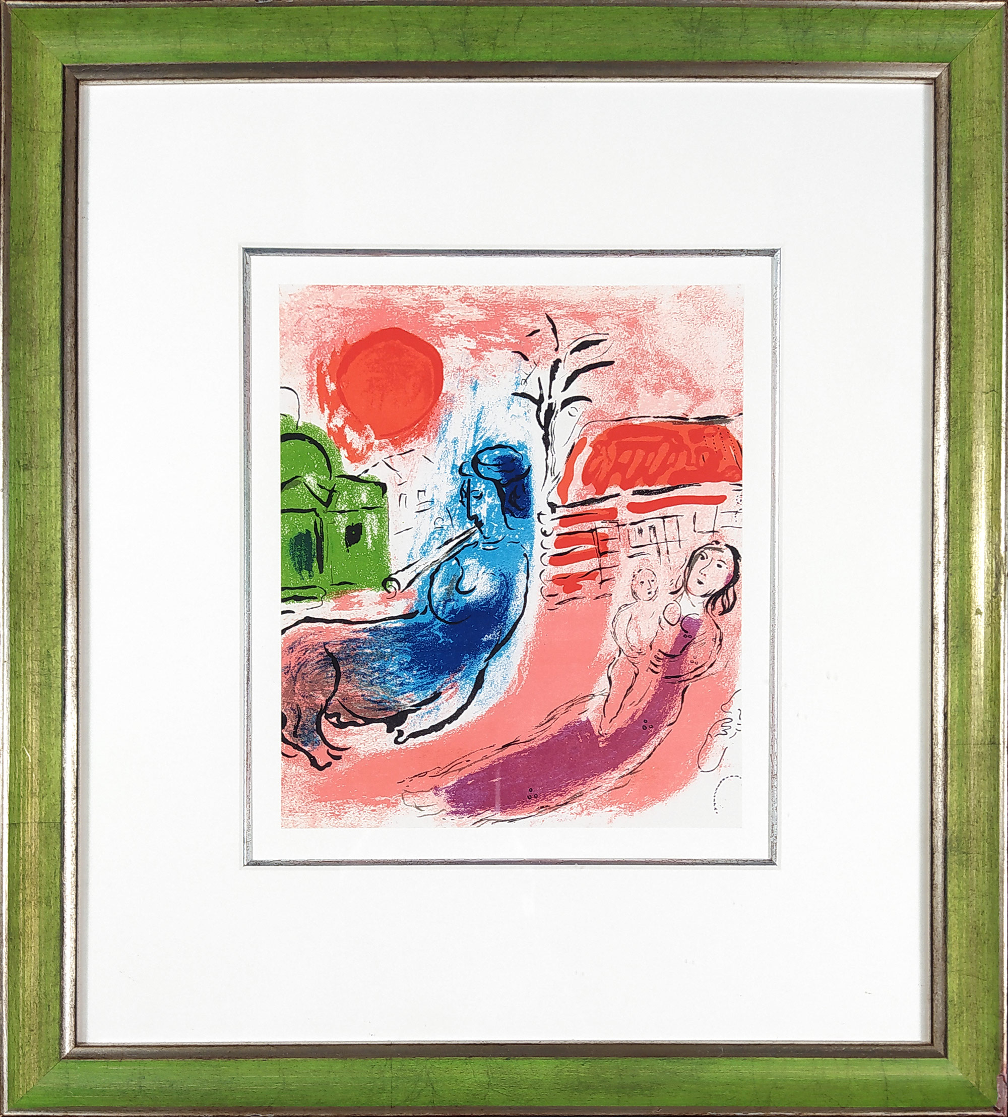 Chagall Marc – Maternité, původní barevná litografie, č. soupisu 195, 1957. Nesignovaná a nečíslovaná litografie. Celkový rozměr v rámu: 45,3 cm × 40,9 cm.