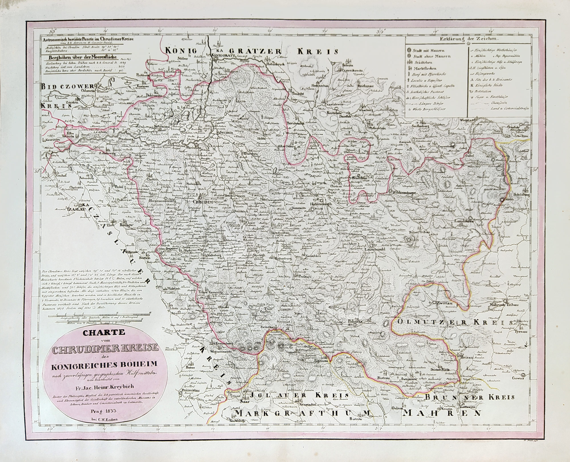 Chrudimský kraj – František Jakub Jindřich Kreibich, staře kolorovaný původní mědiryt, 1833. V oválné kartuši německý název: „Charte vom Chrudimer Kreise des Königreiches Böheim ... Prag 1833“. Vydal Carl Wilhelm Enders v Praze. Celkový rozměr: 42,9 cm × 53,4 cm.