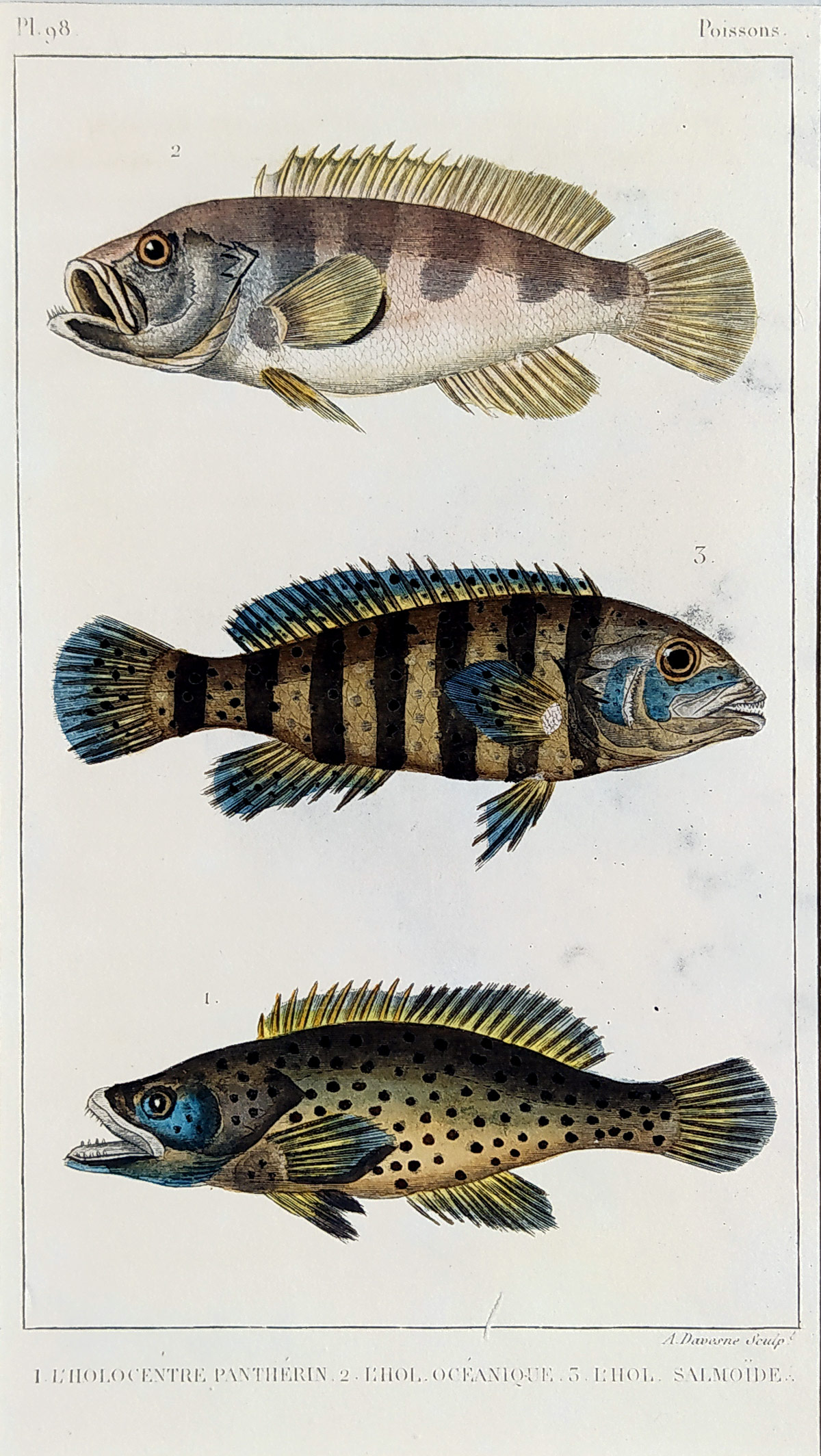Cuvier Georges – Ryby, staře kolorovaný původní oceloryt, 1832. Podle předlohy M. Pillota ryl A. Davesne. Celkový rozměr v paspartě: 29,6 cm × 20,5 cm.