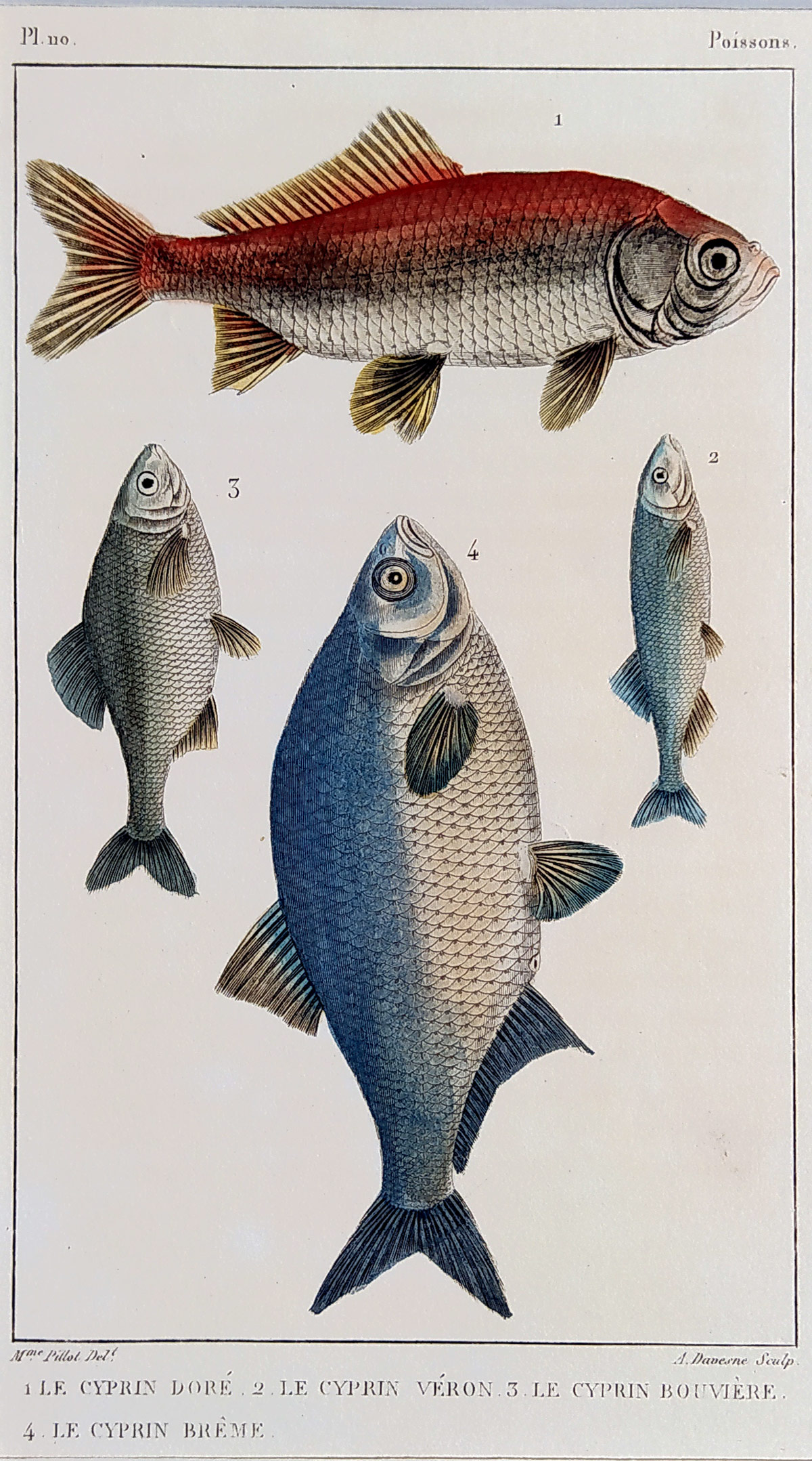 Cuvier Georges – Ryby, staře kolorovaný původní oceloryt, 1832. Podle předlohy M. Pillota ryl A. Davesne. Celkový rozměr v paspartě: 29,6 cm × 20,5 cm.