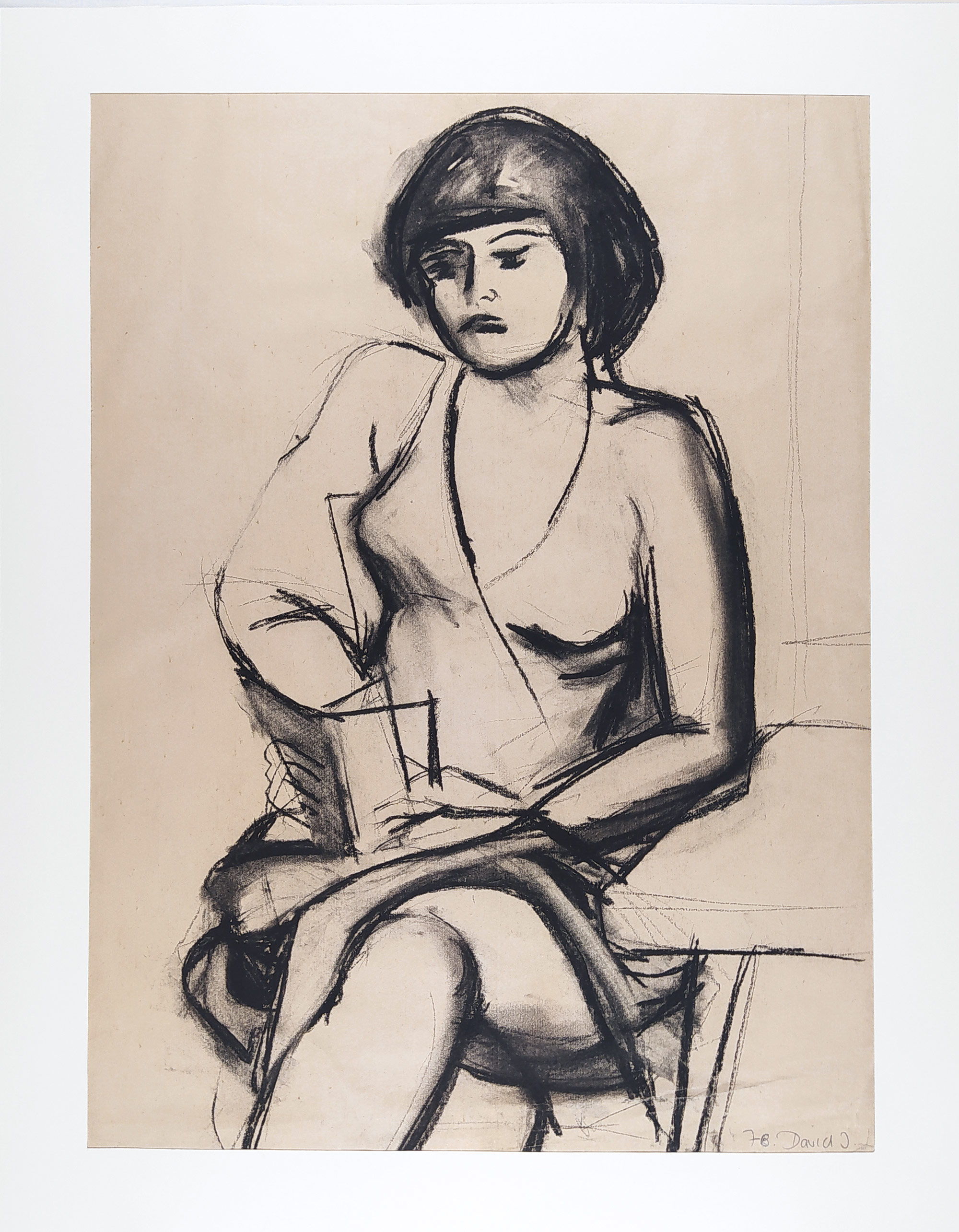 David Jiří – Zdena, studie ženy, kresba uhlem, 1976. Signováno tužkou vpravo dole s datací. Celkový rozměr: 70,6 cm × 53,1 cm.