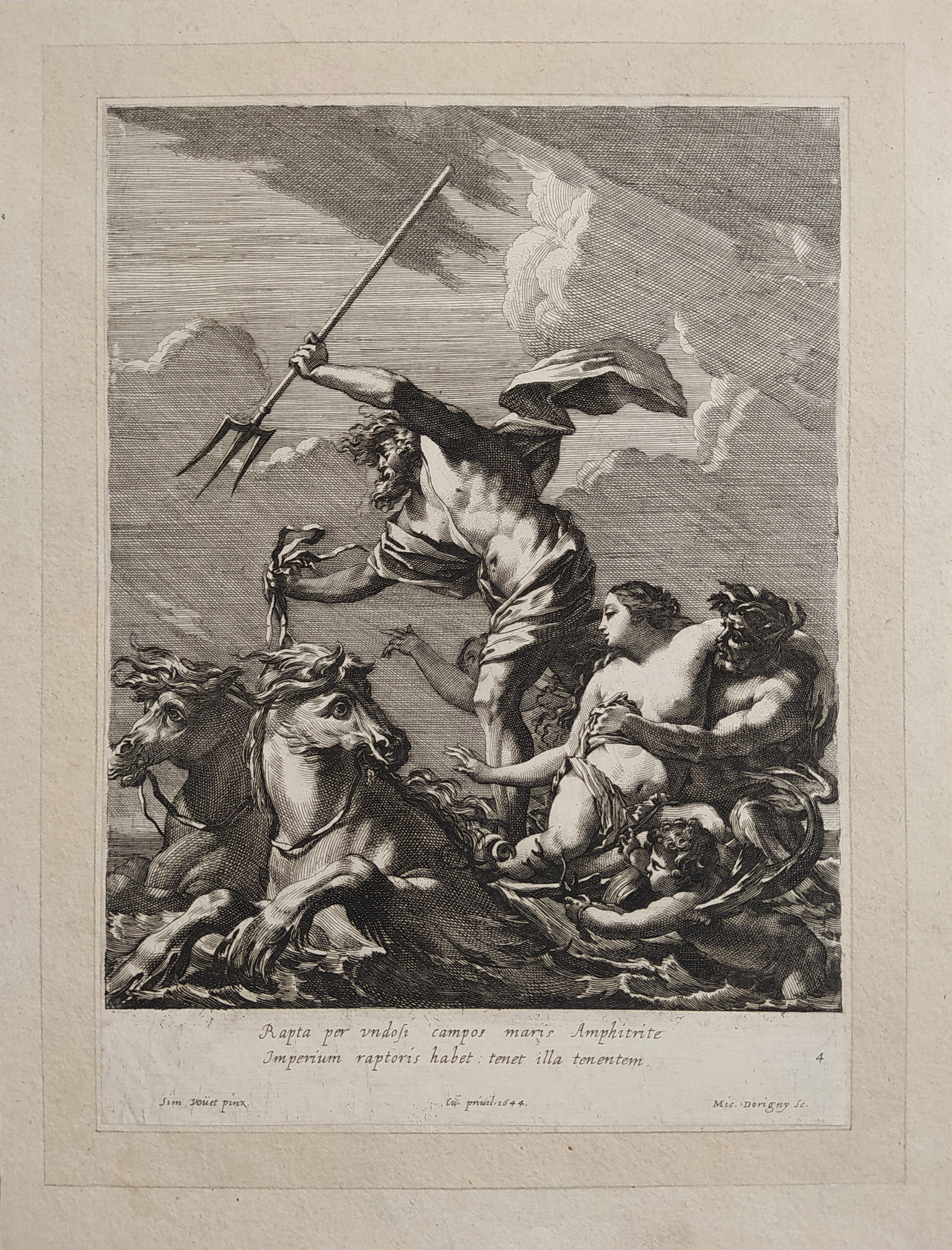Dorigni Michel – Neptun a Amfitrité, původní mědiryt, 1644. Tabula 4 – živel vody. Neptun tažený přes oceán mořskými koníky, vpravo Amfitrité nesená svým synem Tritonem. Pod vyobrazením název listu: „Rapta per undosi campos maris Amphitrite imperium raptoris habet: tenet illa tenentem“. Podle předlohy S. Voueta vyryl Michel Dorigni.