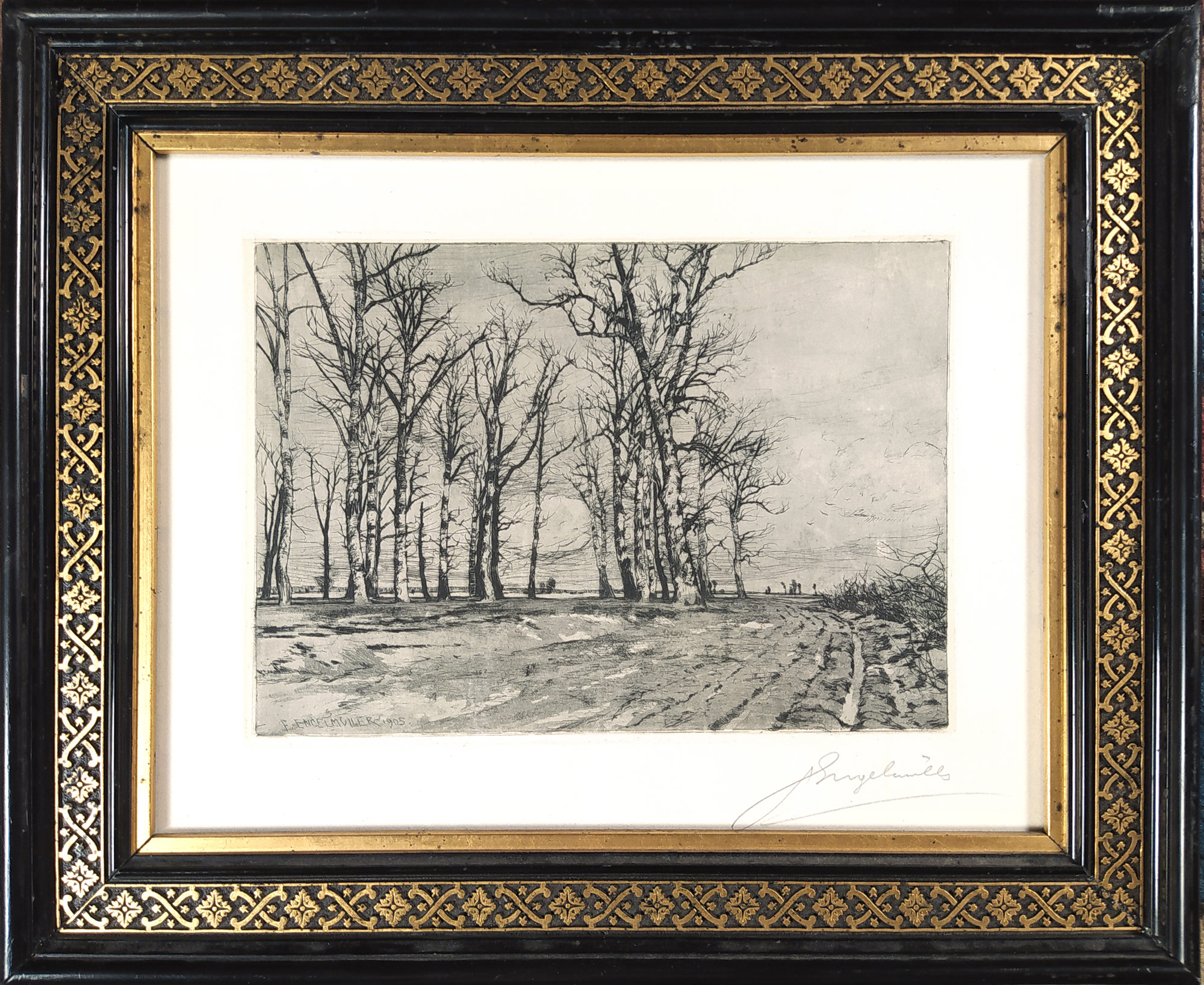 Ferdinand František Engelmüller – Předjaří, původní lept, 1905. Signováno tužkou vpravo dole. Celkový rozměr v rámu: 30,7 cm × 37,8 cm.