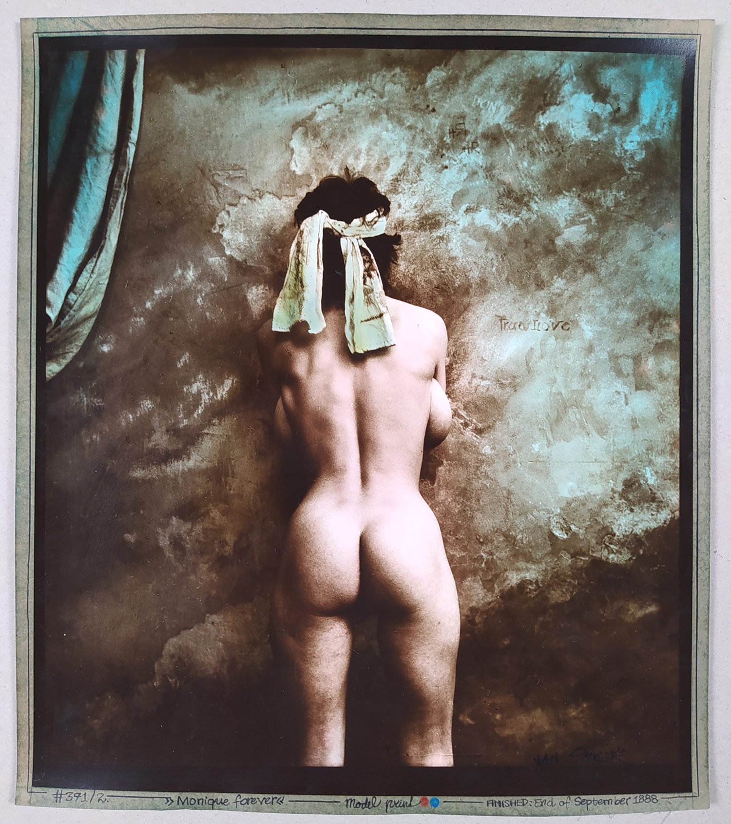 Saudek Jan – Monique Forever #371/2, kolorovaná autorská fotografie, 1988. Přiložen autorem vydaný certifikát originálu. Celkový rozměr fotografie na podkladním papíře: 35,6 cm × 30,9 cm.