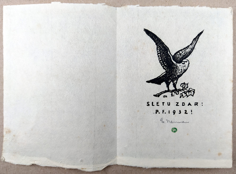 - Nauman Arno – Sletu zdar! P.F. 1932!, dřevoryt, 1931