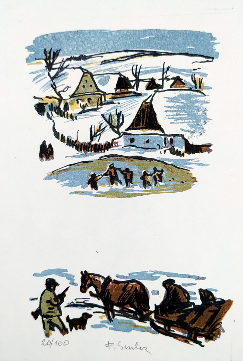 - Emler František – Zimní motiv, původní barevná litografie, 1986