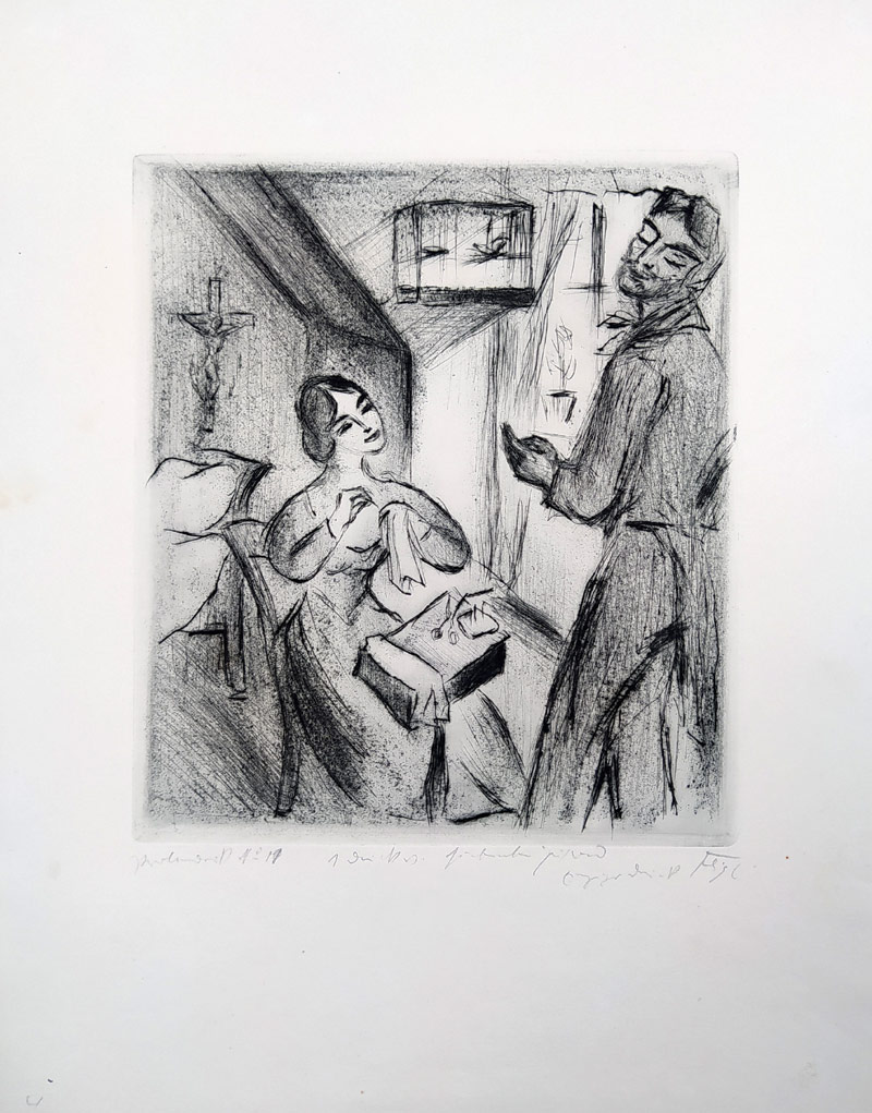 Feigl Friedrich – Gobseck, ilustrace k Balzacovi, suchá jehla, nedatováno. Zkušební tisk č. 11, signováno tužkou vpravo dole. Celkový rozměr: 31,8 cm × 25 cm.