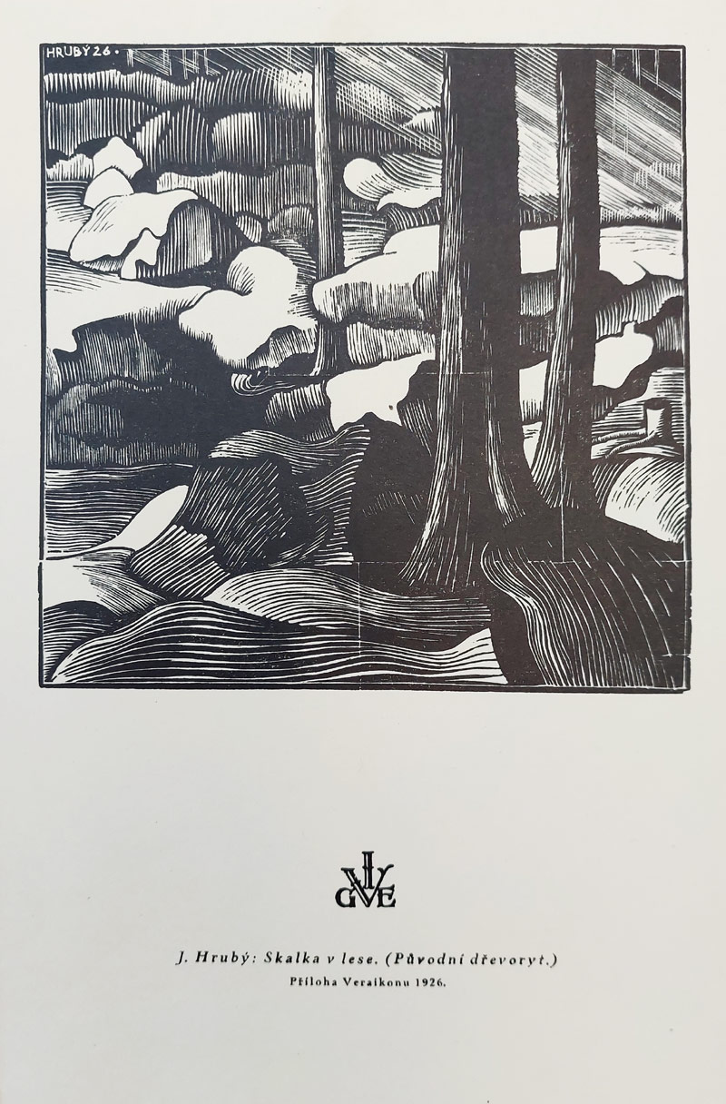 Hrubý, Josef – Český malíř a grafik. Skalka v lese, dřevoryt, 1926. Příloha Veraikonu ročník XII. Celkový rozměr 23,8 cm × 15,7 cm.