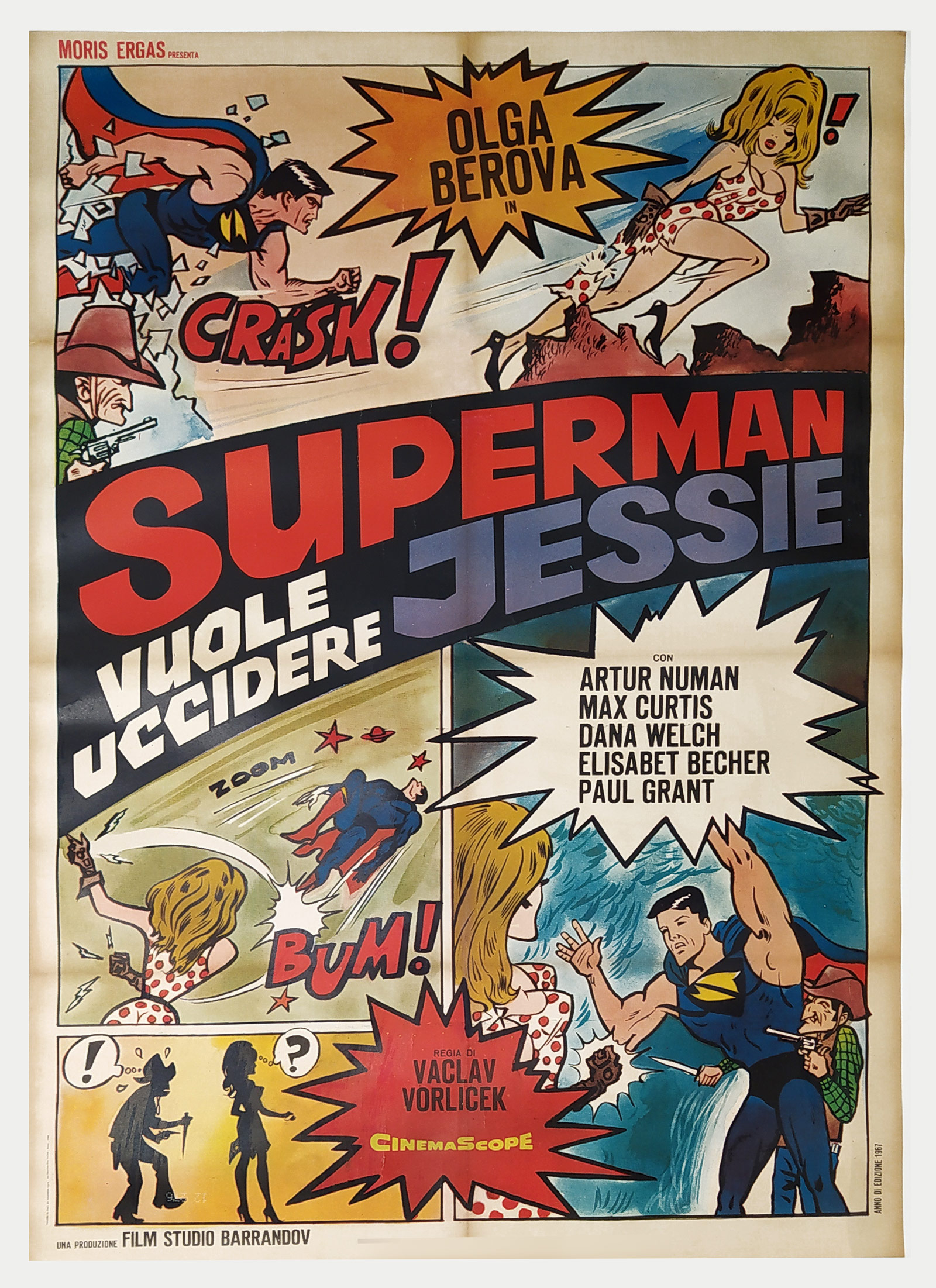 Saudek Kája – Superman vuole uccidere Jessie, ofset, 1967. Raritní zahraniční plakát ke kultovní české komedii "Kdo chce zabít Jessii?", v roce 1967 vydal Policrom v Římě. Publikováno v katalogu "Filmové plakáty Káji Saudka" – vydala Filmová galanterie Terryho ponožky a Galerie Mona Lisa, 2013. SUPERMAN VUOLE UCCIDERE JESSIE / KDO CHCE ZABIT JESSII?