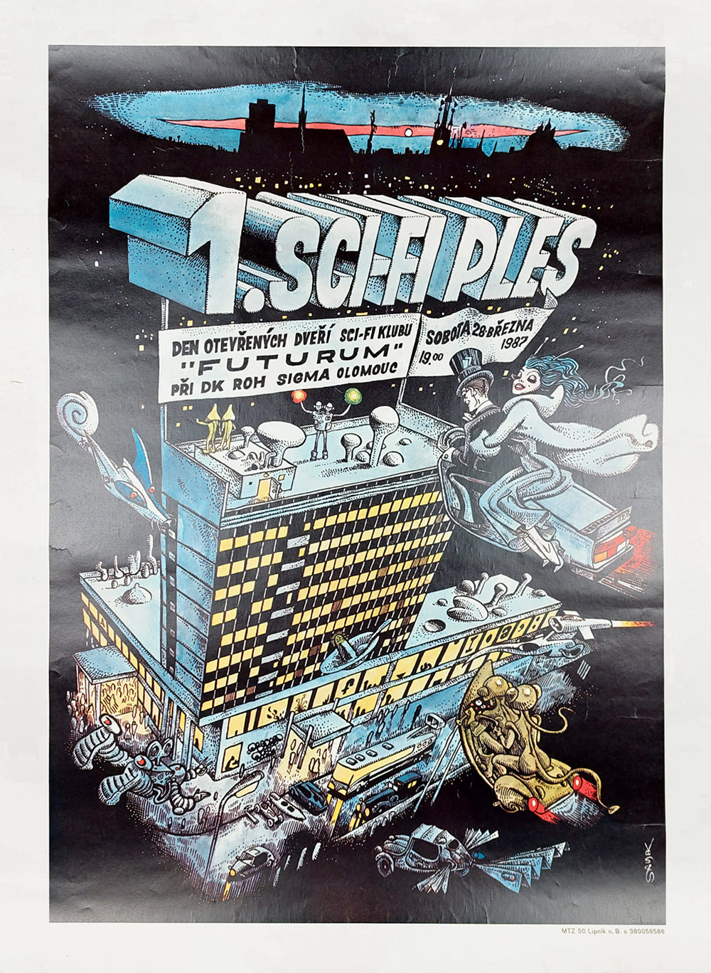 Saudek Kája – 1. sci-fi ples, ofset, 1987. Celkový rozměr 63 cm × 46,5 cm.