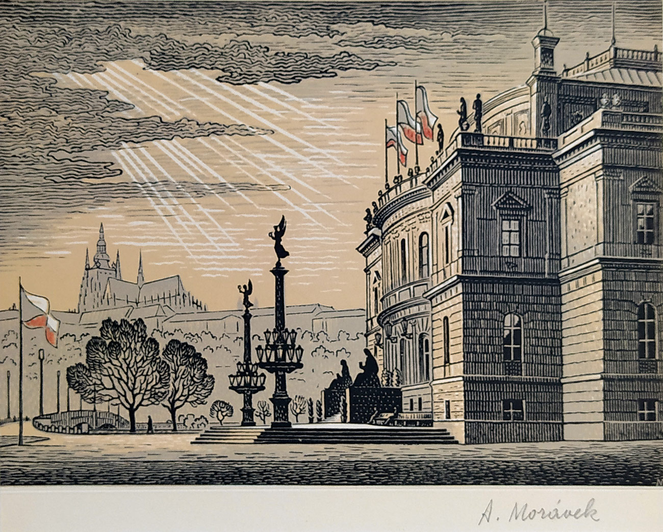 - Morávek Antonín – Praha, Rudolfinum, kolorovaný dřevoryt, ca 1940