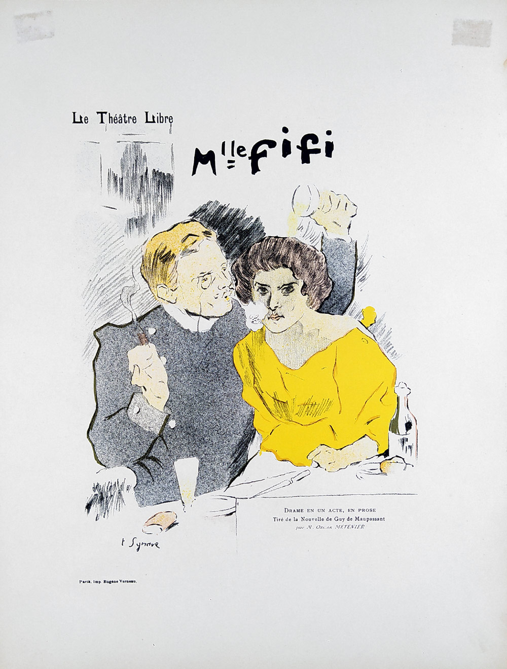 Synave, Tancrede – litografie, plakát k programu Le Theater Libre v Paříži v roce 1896, pro divadelní hru Mademoiselle Fifi podle stejnojmenné povídky Guye de Maupassanta. Album E. Maindron The Illustrous Programs of Theatres and Concert Caves. Celkový rozměr: 31,8 cm × 24,5 cm.