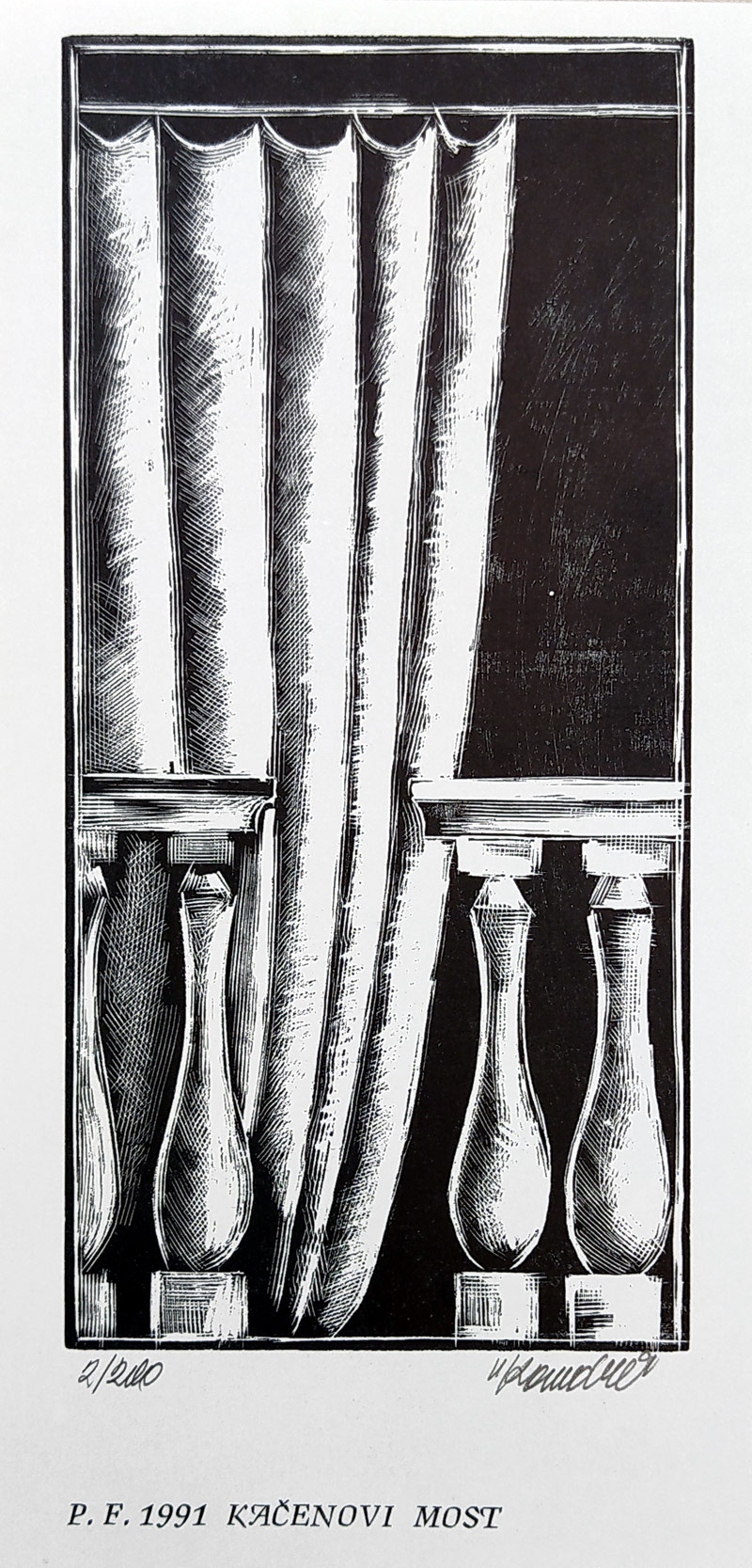 - Komárek Vladimír – PF 1991 Kačenovi Most, původní dřevoryt, 1990