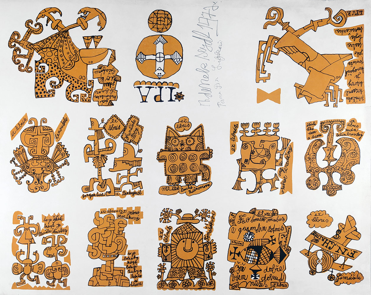 Seydl Zdenek – 13 Ex libris, původní litografie s dedikací, 1972. Signováno tužkou s dedikací: Zdenek Seydl panu Dr. Lifkovi 1972. Celkový rozměr 43,8 cm × 54,2 cm.