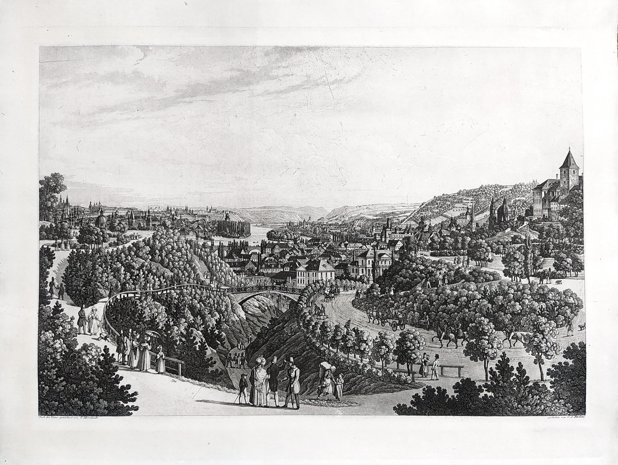 Praha s Letné – Vincenc Morstadt, C. A. Richter, lept s akvatintou (1836), pozdější otisk z původní desky