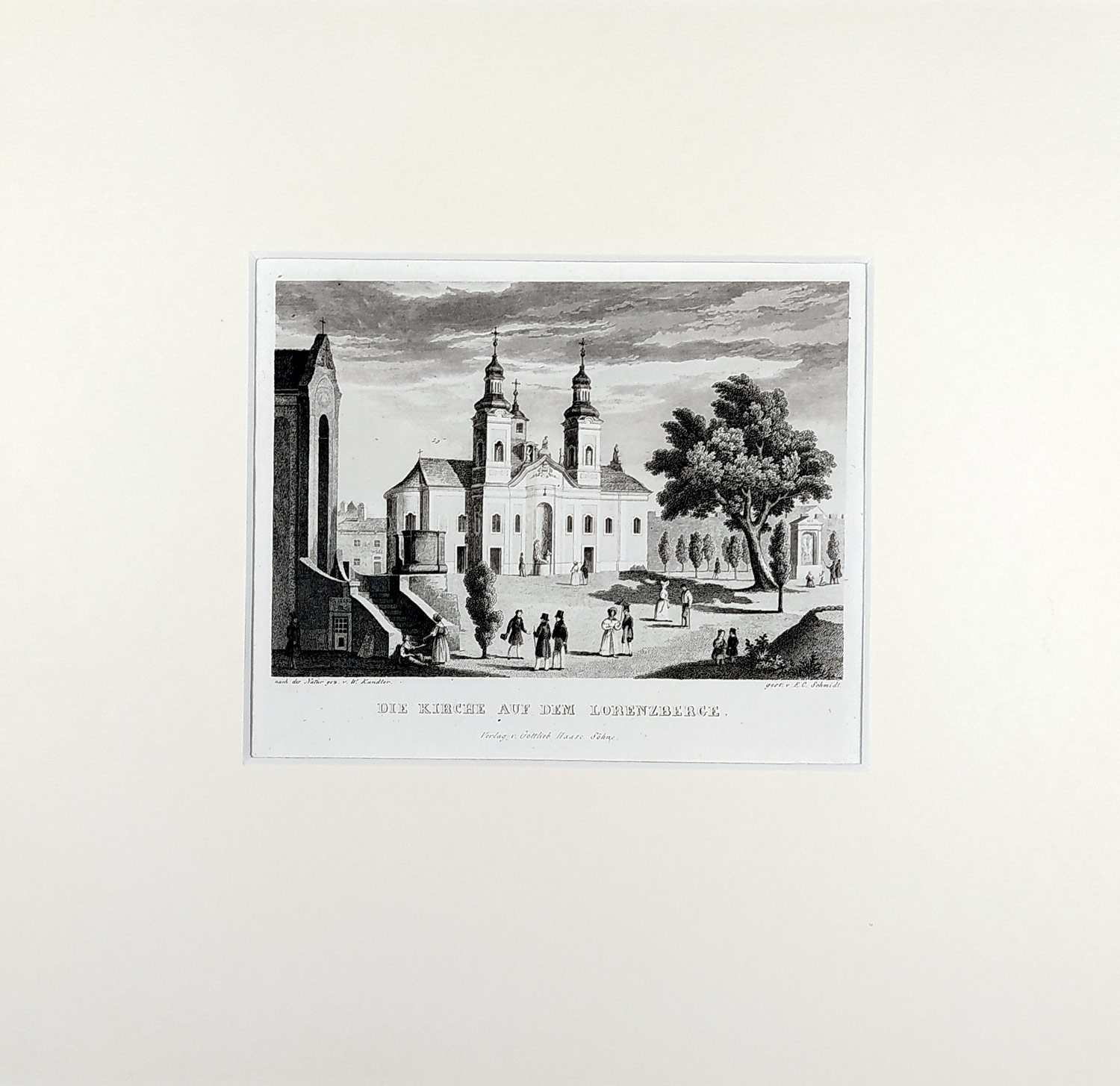 Praha – Kostel sv. Vavřince na Petříně, původní oceloryt, 1836. Podle předlohy W. Kandlera ryl E. C. Schmidt. Vydáno v Praze roku 1836, Verlag von Gottlieb Haase Söhne.