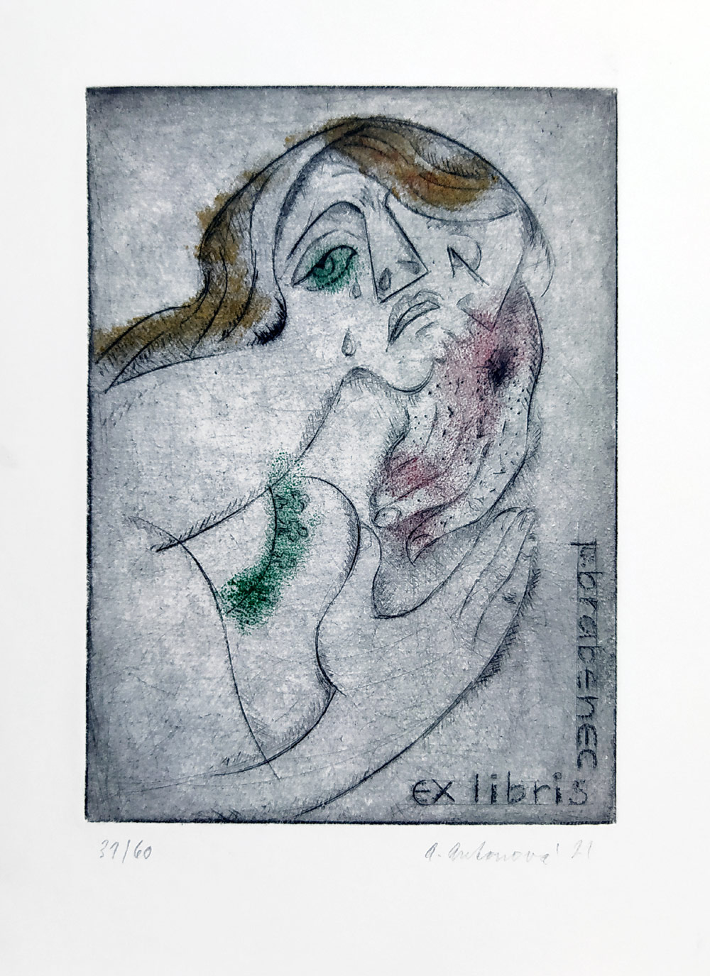 Antonová Alena – Ex libris Brabenec, číslováno 31/60, kolorovaný lept a suchá jehla, 2021. Celkový rozměr: 20,1 cm × 14,8 cm.