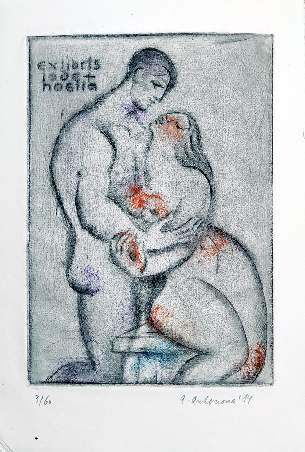 Antonová Alena – Milenci, Ex libris, číslováno 3/60, kolorovaná suchá jehla, 2014.