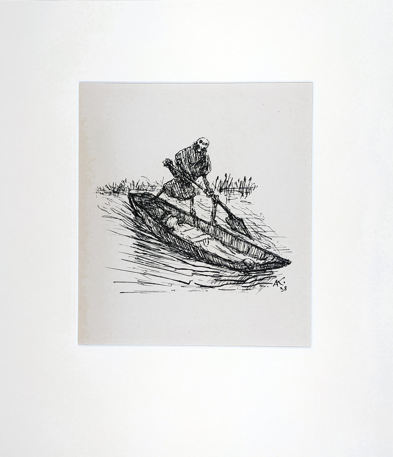 Kubin Alfred – Charon, XXIV, Ein neuer Totentanz, klasický ofset, 1947 podle kresby z roku 1938. Vydáno ve Vídni roku 1947. Celkový rozměr v paspartě: 45,9 cm × 39,0 cm.