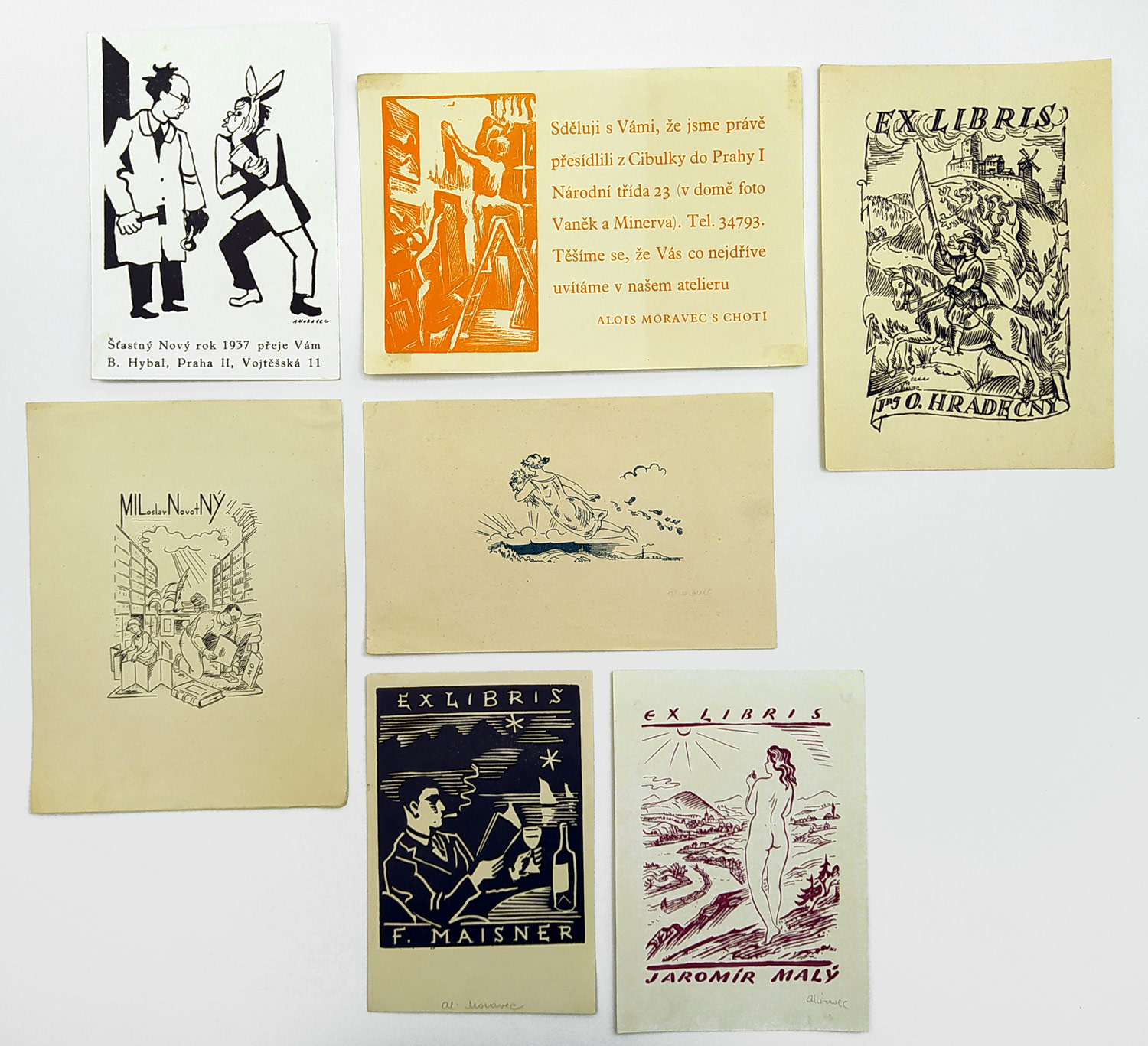 Moravec Alois – Konvolut Ex libris, oznámení a PF , rúzné techniky, ca 1930. Ex libris F. Maisner, Jaromír Malý, Ing. O. Hradečný, Miloslav Novotný, Novoročenka 1931, Novoročenka 1937, Oznámení přesídlení atelieru.