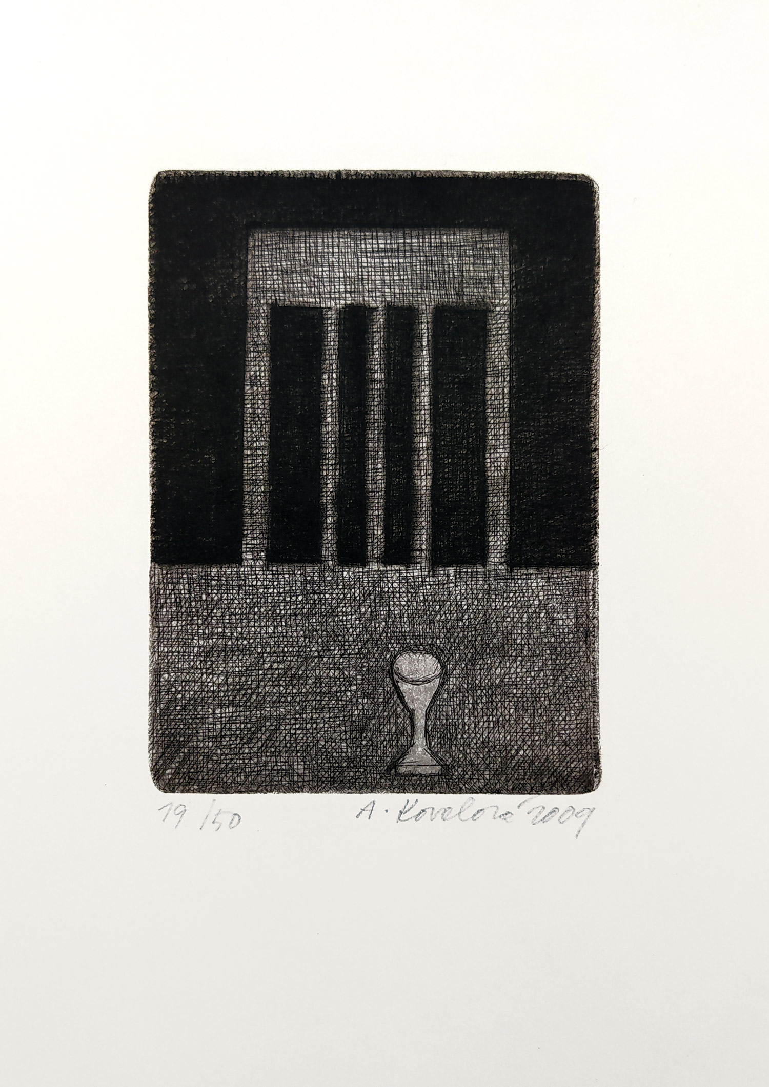 - Kovalová Anežka – U stolu, signovaná suchá jehla, č. 19/50, 2009