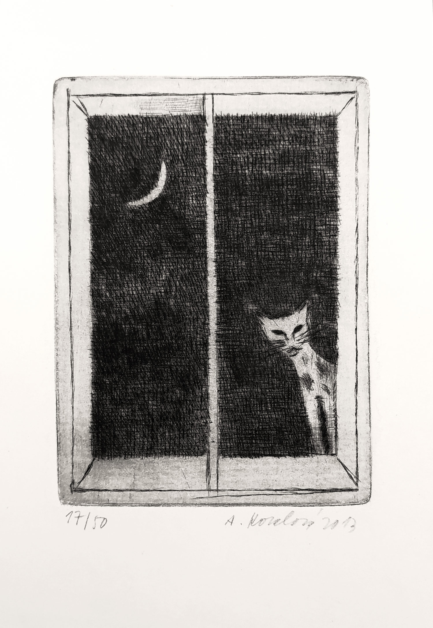 Kovalová Anežka – V noci, signovaná suchá jehla, č. 17/50, 2013. Signováno tužkou vpravo dole s datací. Celkový rozměr 14,7 cm × 10,1 cm.