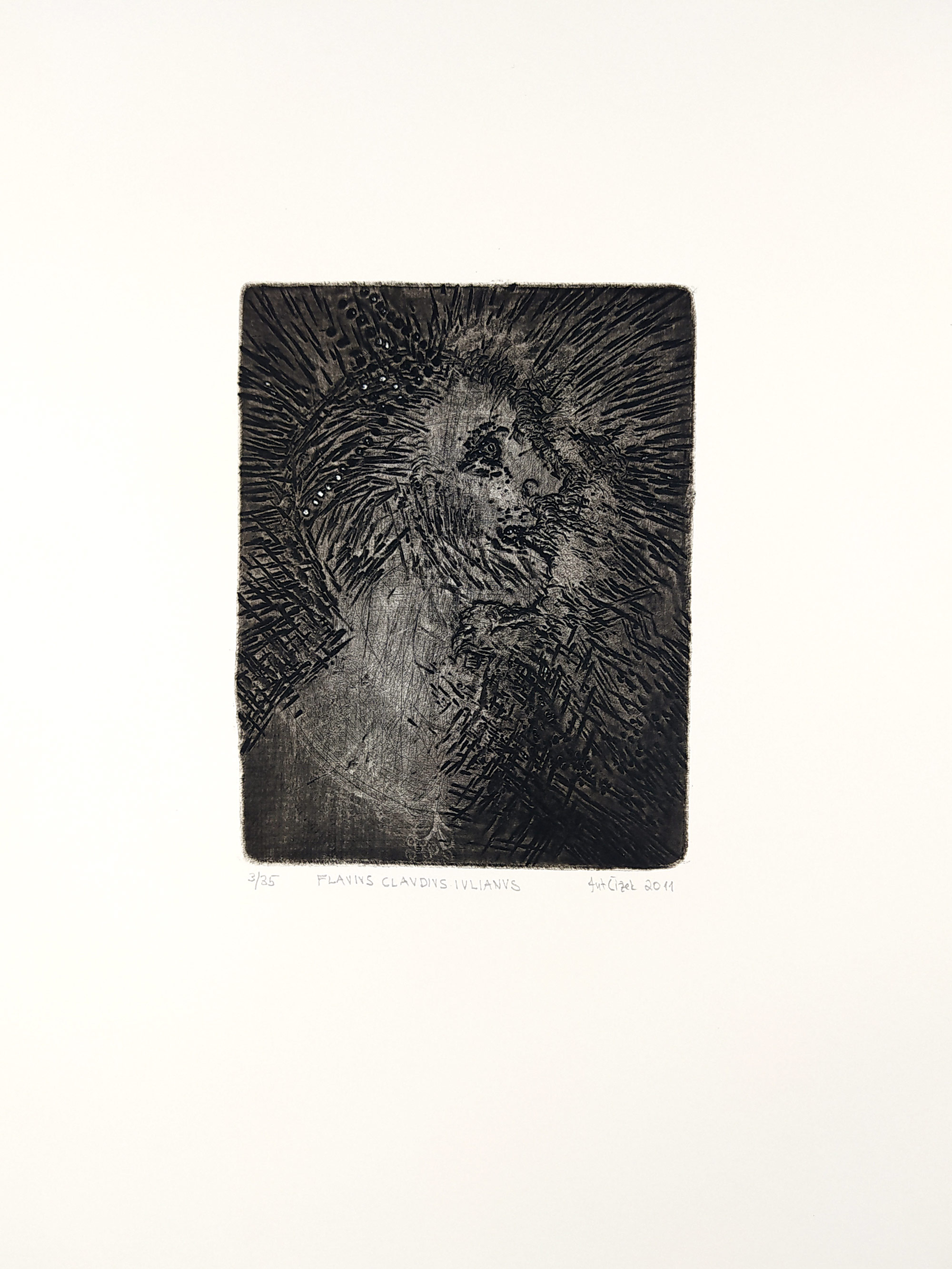 Čížek Antonín – Flavius Claudius Iulianus, vysekáno dlátem do matrice, č. 3/35, 2011. Vytiskl Milan Dřímal. Signováno tužkou vpravo dole s datací. Celkový rozměr: 33,0 cm × 24,8 cm.