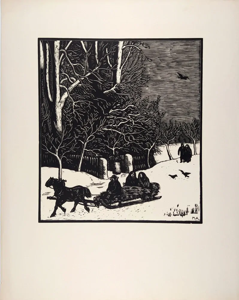 - Majer Antonín – Zima, původní dřevoryt na ručním papíře Holland Pannekoek, ca 1930