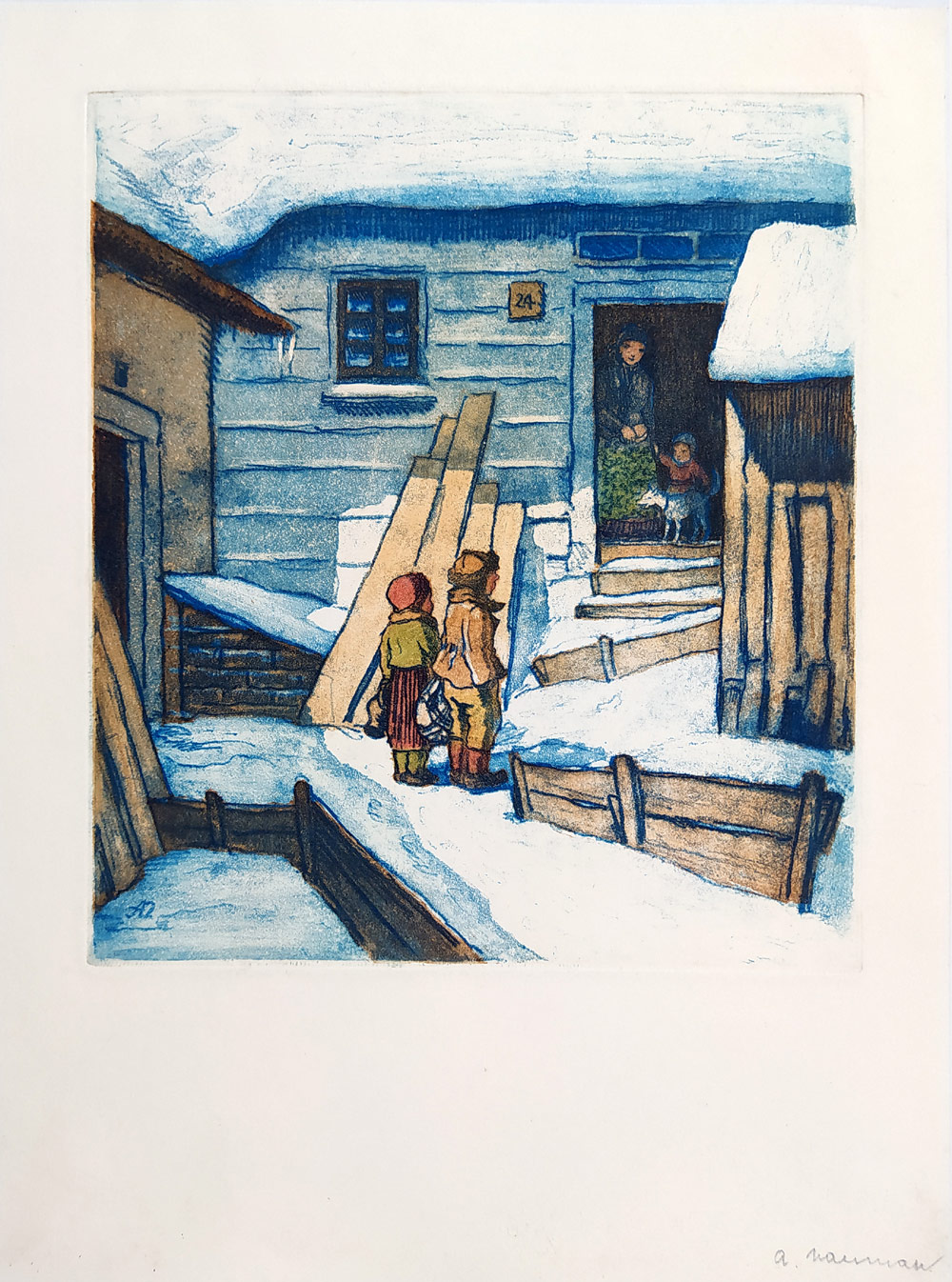 - Nauman Arno – Koledníci, zrnkový barevný lept, ca 1930