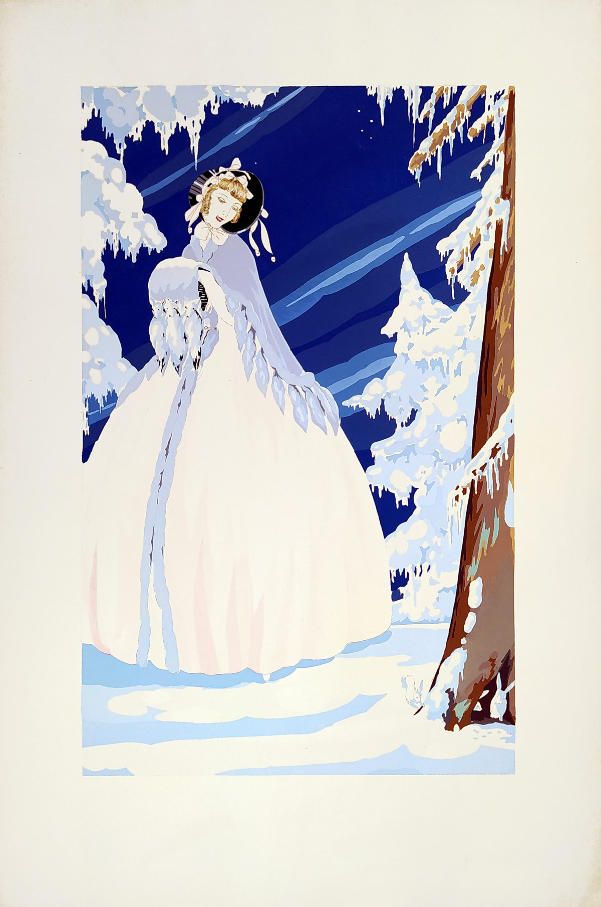 - Art deco – Zimní motiv, kvašem kolorovaný lept, ca 1910