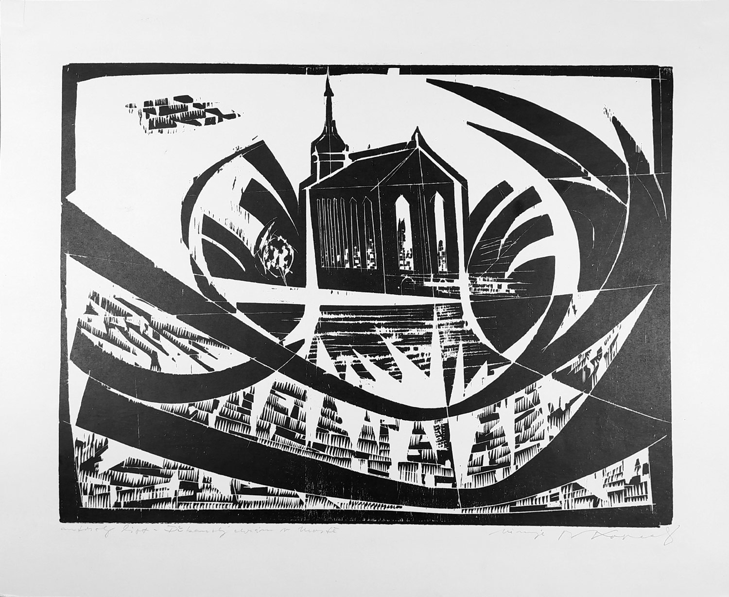 Kopecký Bohdan – Děkanský chrám v Mostě, autorský list, dřevoryt, nedatováno. Signováno tužkou vpravo dole. Celkový rozměr 39,2 cm × 48,1 cm.