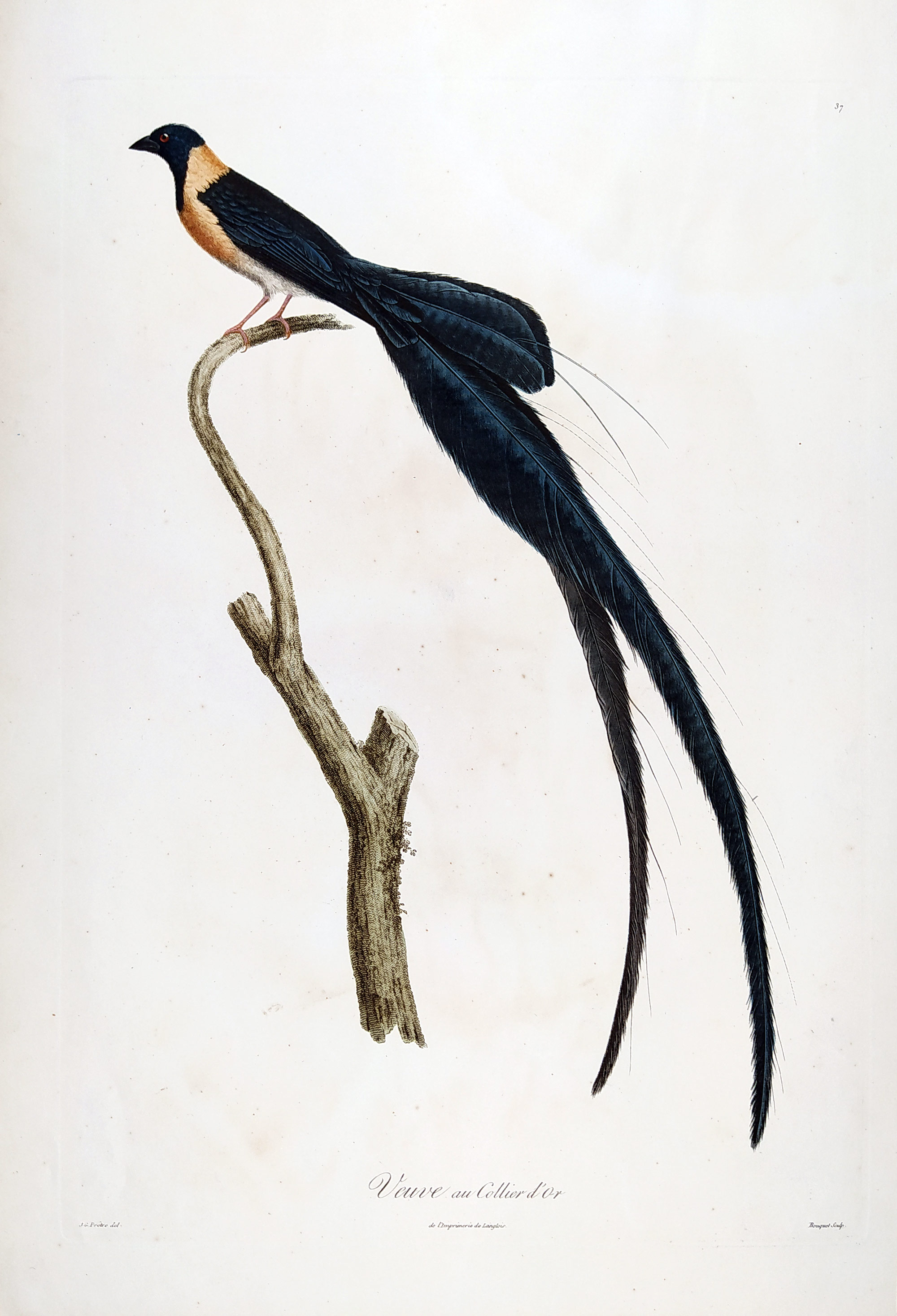 Vdovka dlouhoocasá, „Veuve au Collier d´or“, staře kolorovaný původní lept, 1805.