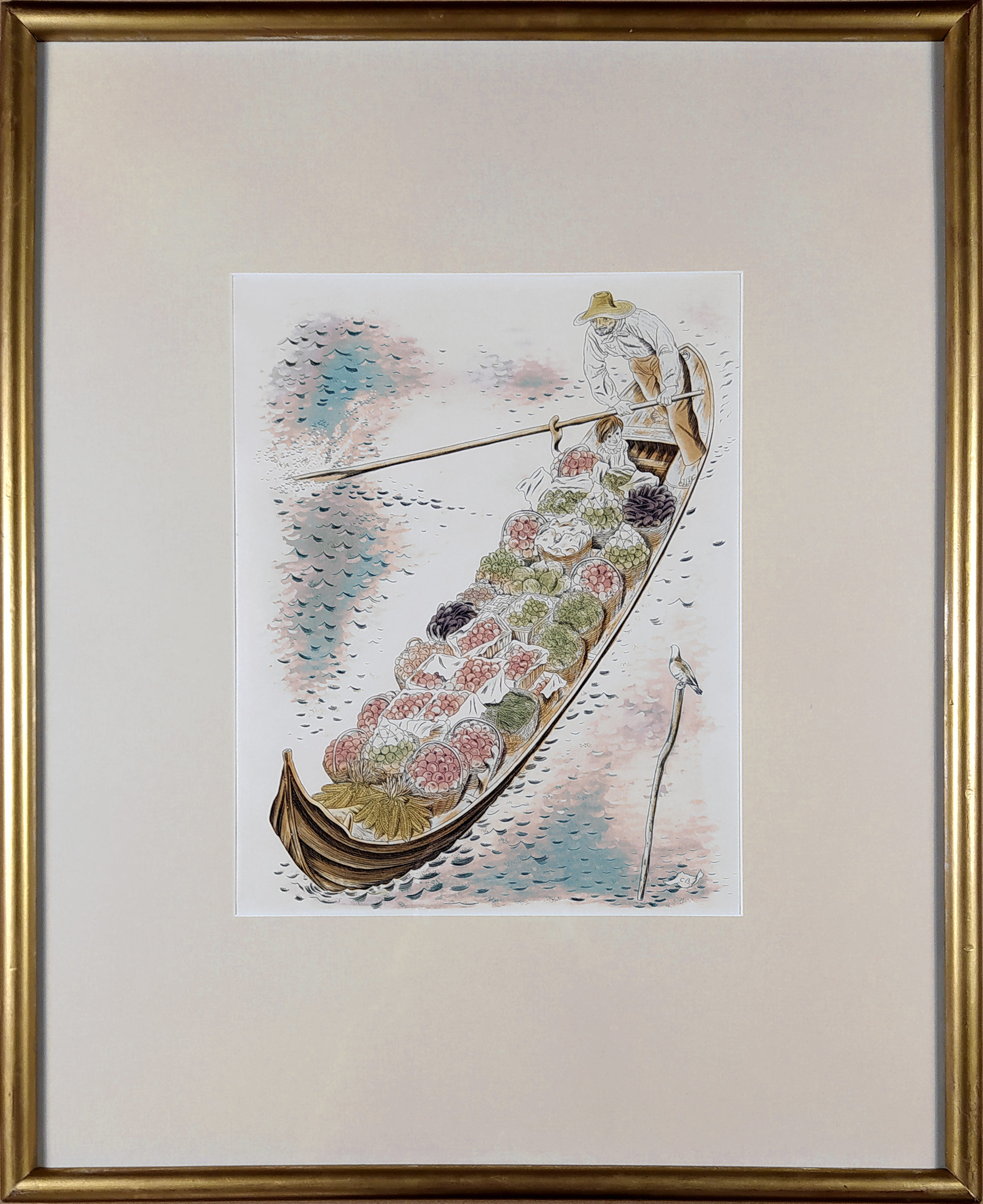 Bouda Cyril – Ovocnář, Praha, původní mědiryt s akvatintou, 1941. Celkový rozměr v rámu: 68,8 cm × 55,9 cm.
