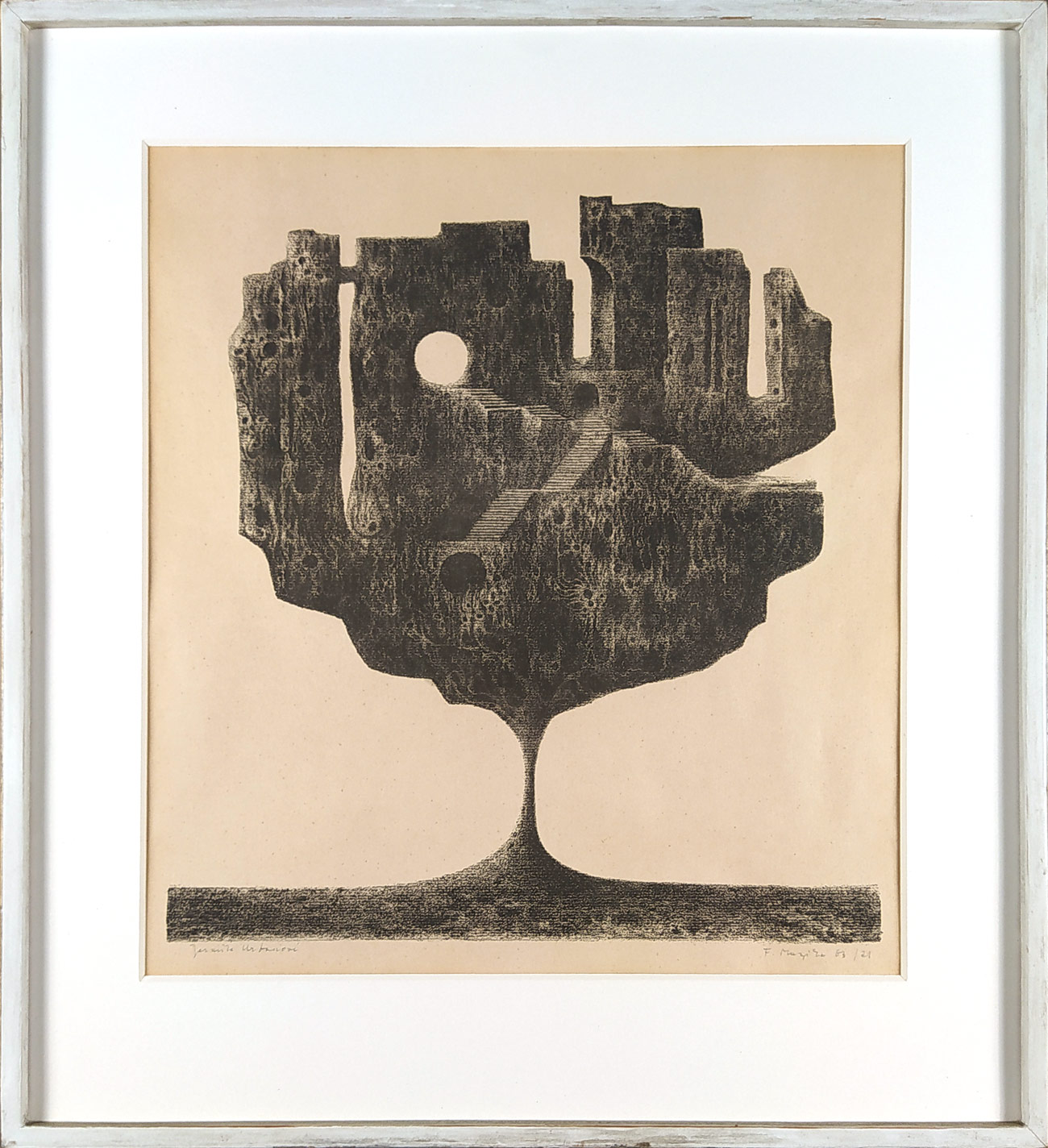 Muzika František – Velký Elsinor, dedikace autora Jarmile Urbanové, původní litografie, 1966. Litografie byla použita na obálku knihy: Šmejkal František – František Muzika – 1966, 1. vydání, Odeon. Signováno tužkou vpravo dole, číslováno 03/21. Celkový rozměr v rámu: 55,7 cm × 51,8 cm.