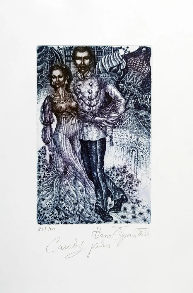 Čápová Hana – Carský ples, barevný lept, číslováno 83/100, 2013. Signováno tužkou vpravo dole s datací. Celkový rozměr listu: 23,8 cm × 16,2 cm.