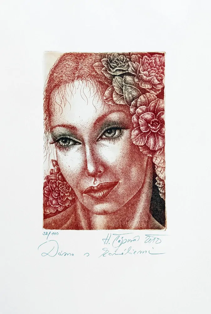 Čápová Hana – Dáma s kaméliemi, barevný lept, číslováno 33/100, 2012. Signováno tužkou vpravo dole s datací. Celkový rozměr listu: 23,8 cm × 15,9 cm.
