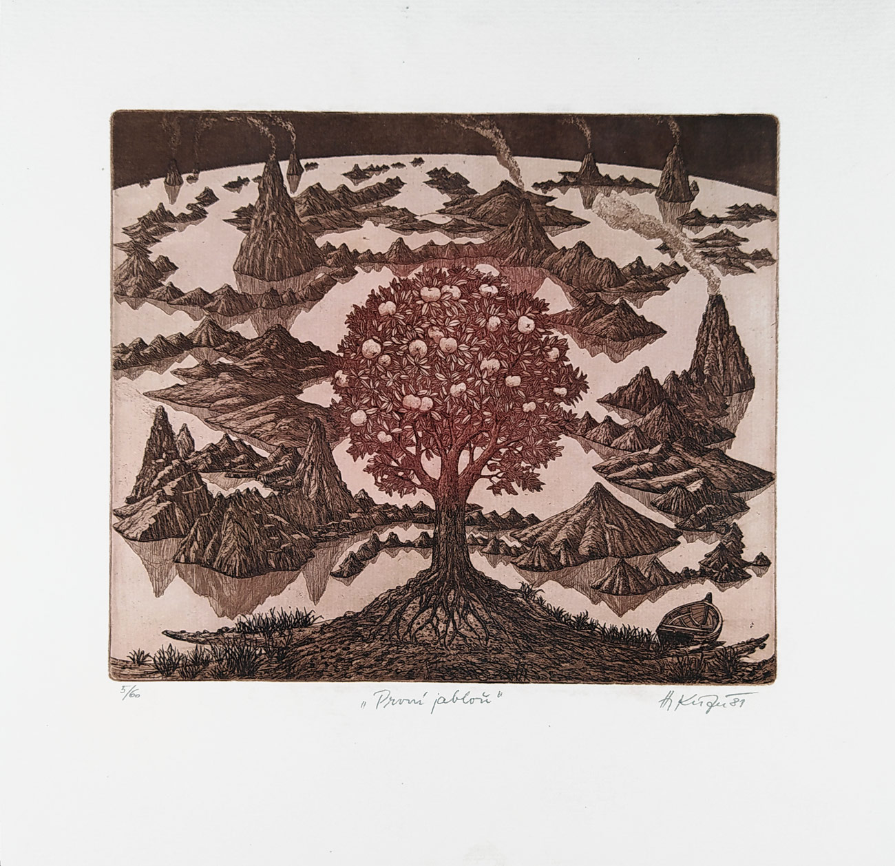 Kisza Herbert – První jabloň, barevný lept s akvatintou, 1981.